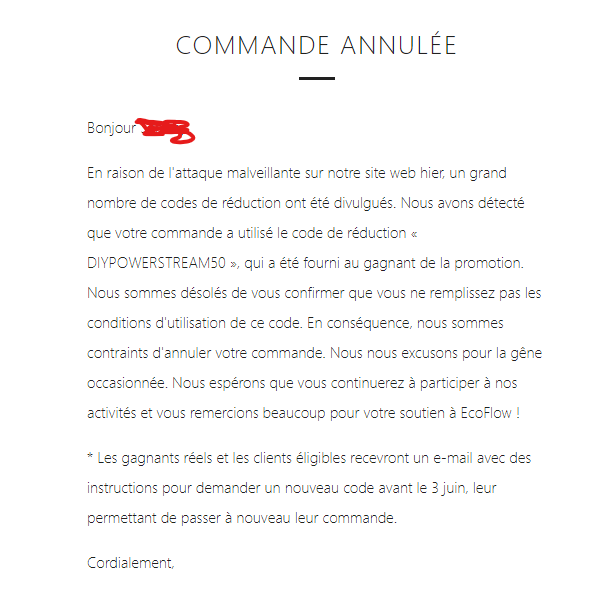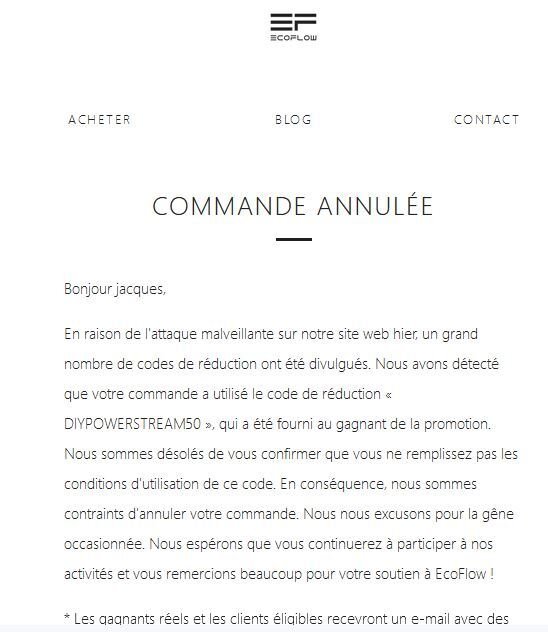 En raison de l'attaque malveillante sur notre site web hier, un grand nombre de codes de réduction ont été divulgués. Nous avons détecté que votre commande a utilisé le code de réduction « DIYPOWERSTREAM50 », qui a été fourni au gagnant de la promotion. Nous sommes désolés de vous confirmer que vous ne remplissez pas les conditions d'utilisation de ce code. En conséquence, nous sommes contraints d'annuler votre commande. Nous nous excusons pour la gêne occasionnée. Nous espérons que vous continuerez à participer à nos activités et vous remercions beaucoup pour votre soutien à EcoFlow !