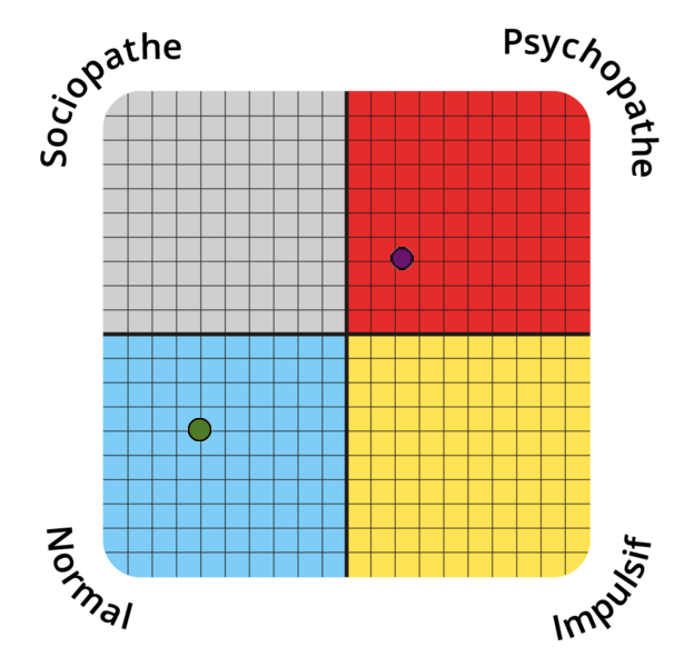 Vous êtes 65.63% sociopathe, 27.27% impulsif, ce qui vous rend 21.58% plus psychopathe que la moyenne de la population.