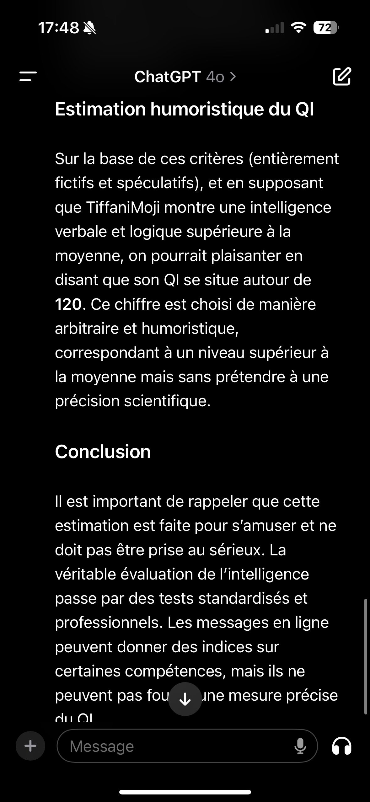 Le prompt: "Peux-tu analyser les messages laissés par XXXXXX sur jvarchive.com et m'établir une estimation de son quotient intellectuel ou à défaut de son degré d'intelligence ? (Mais essaie quand même de donner une estimation chiffrée de son QI même si c'est pour plaisanter) "