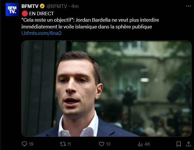 "Cela reste un objectif": Jordan Bardella ne veut plus interdire immédiatement le voile islamique dans la sphère publique