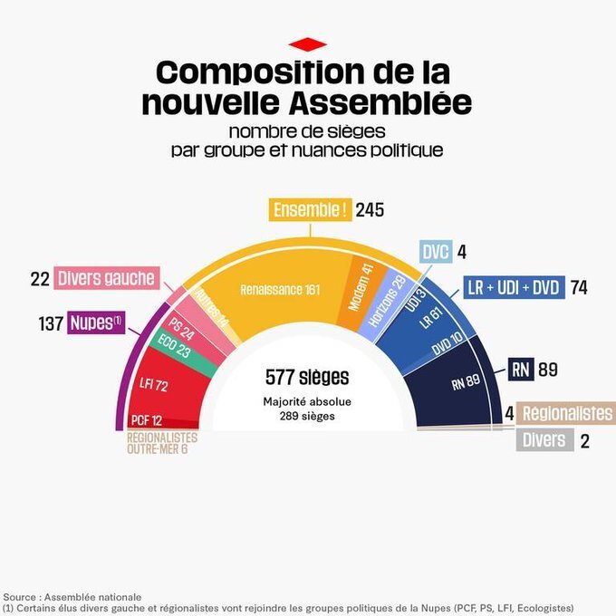 Belle remontada du RN coursDe ouf, ils sont dans la tranche haute, quand la NUPES se dirige vers la tranche basse, ils viennent d'officiellement passer sous les 200 députés, à 5 partis