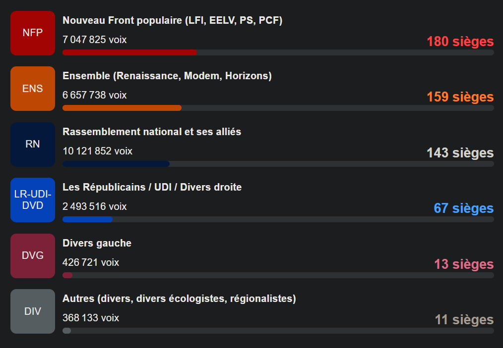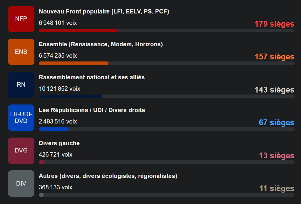 Comme prévu le NFP a 180 sièges, valeur moyenne des derniers sondages.