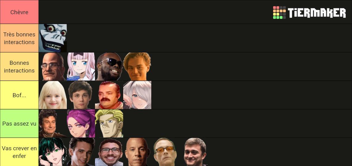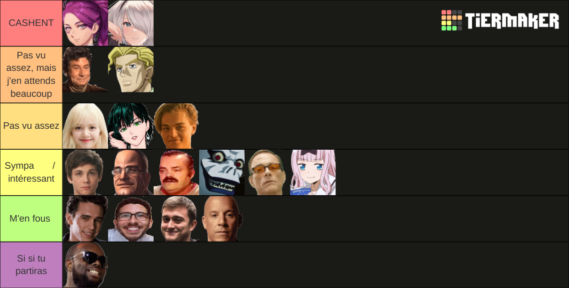 J'ai du refaire légèrement ma tier list puisque je n'avait pas bien assimilé la tête de certains persos Moussa meurt et son cousin Marcus arrive dans la fic, ta réac'but ?
