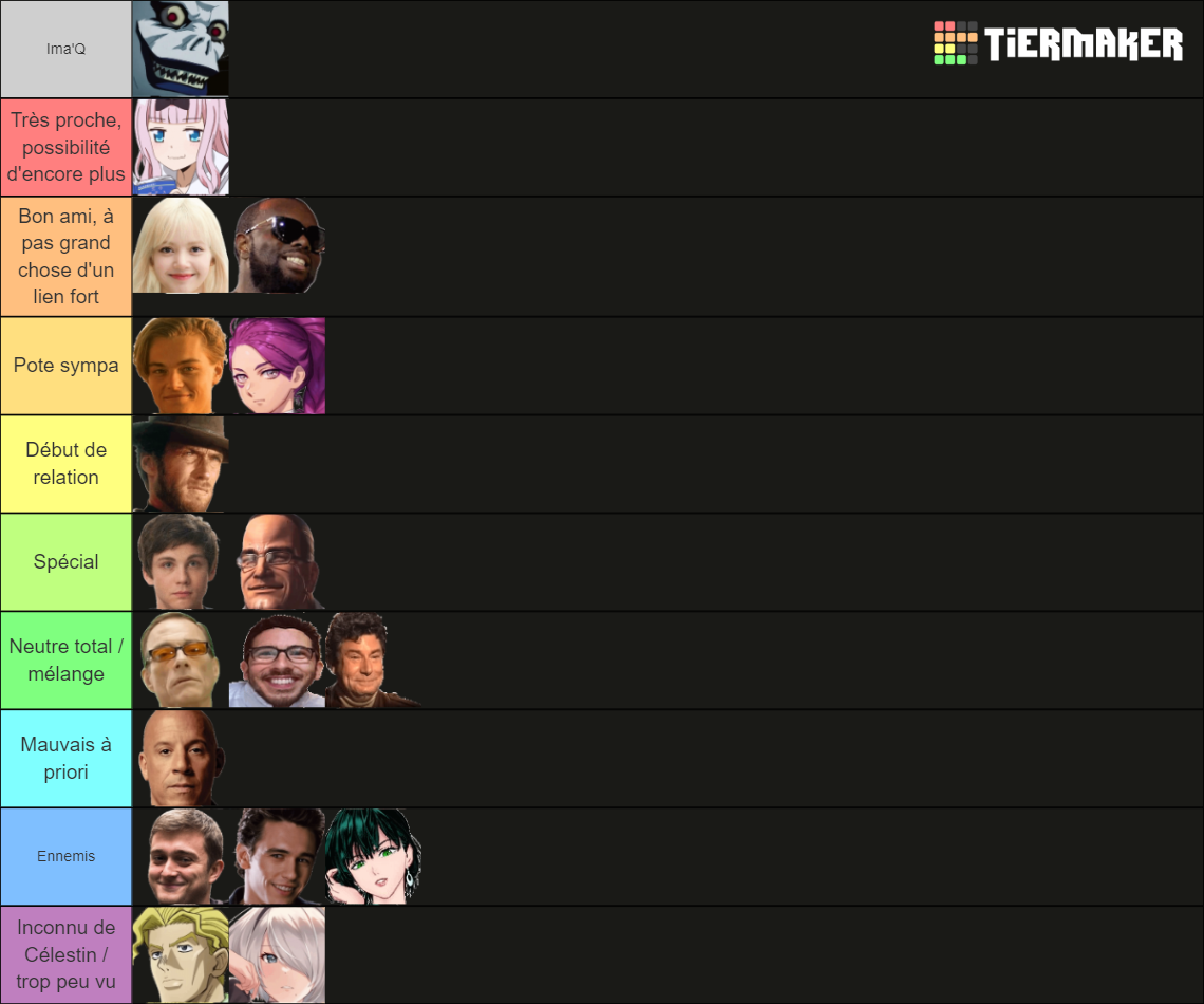 Sinon, petite tierlist de vos relations à l'heure actuelle (la flemme d'écrire et de chercher les stickers pour chaque perso)