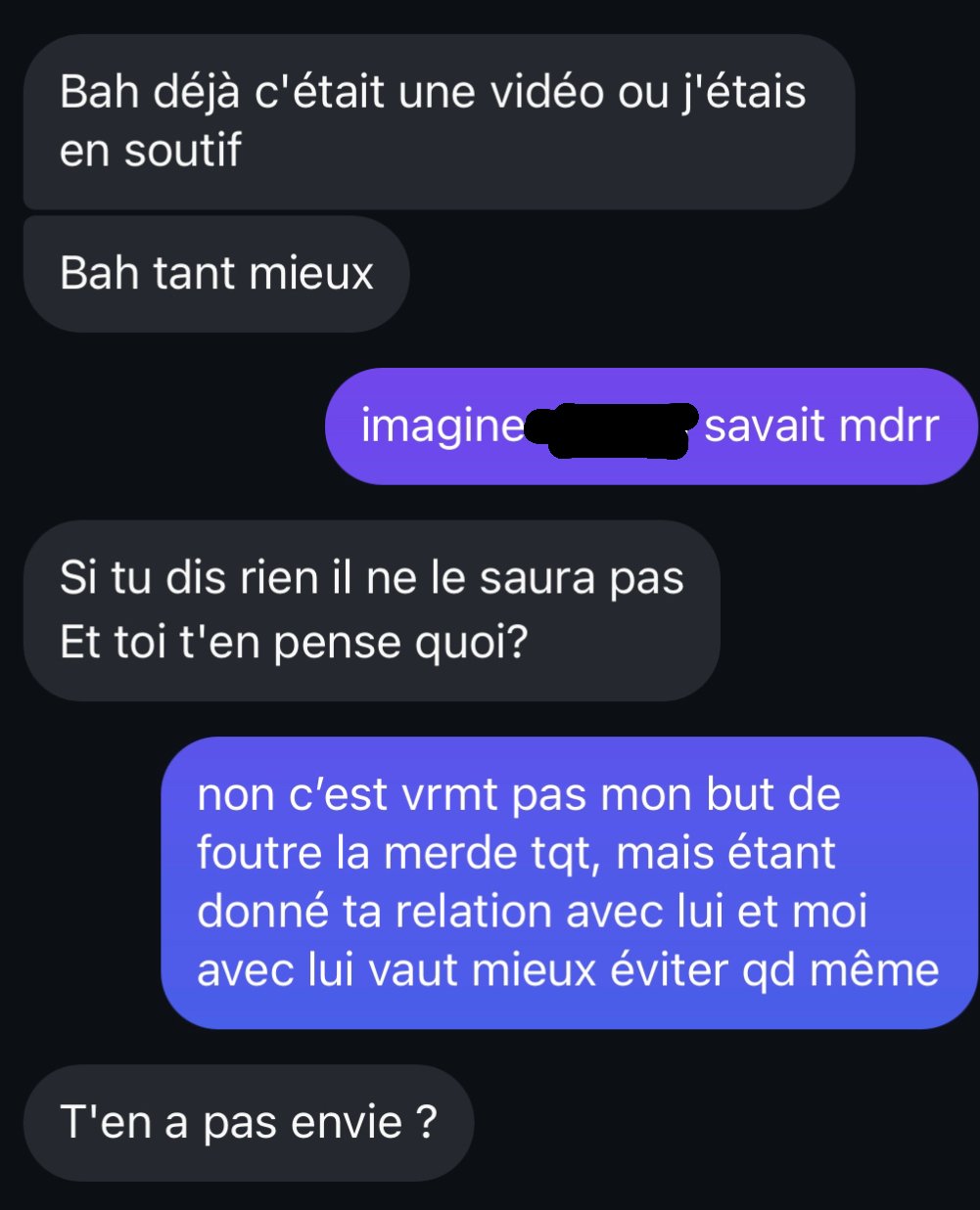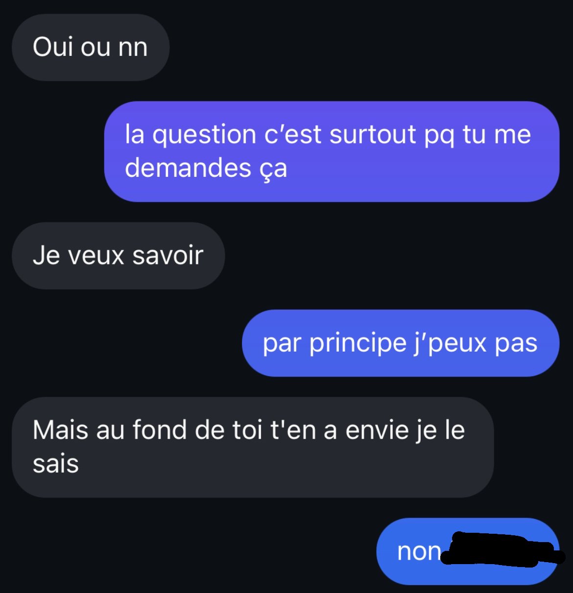 Ayaaaa je lui dis que par principe je peux pas et elle me dit qu’au fond de moi j’en ai envie, qu’elle le sait
