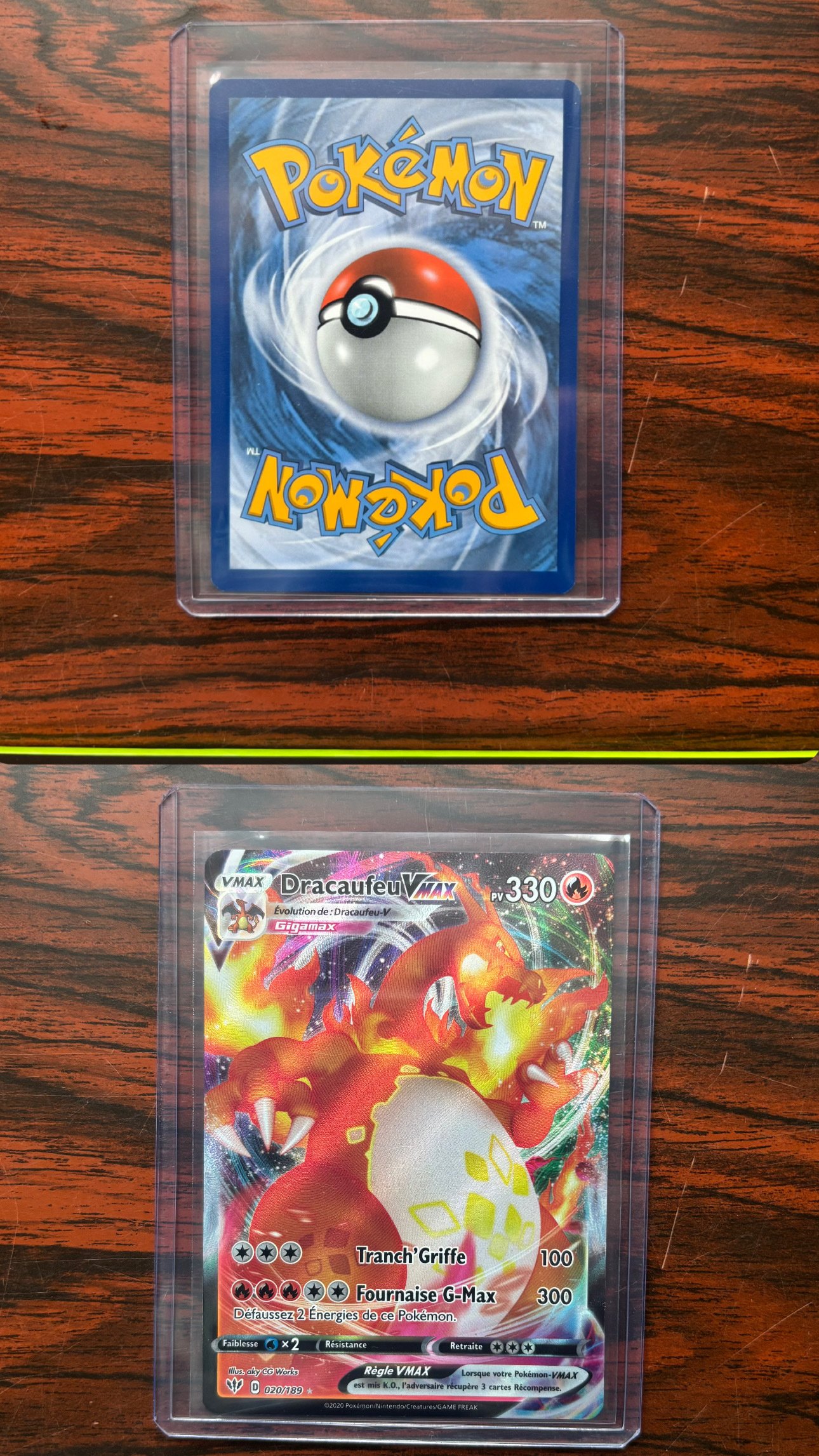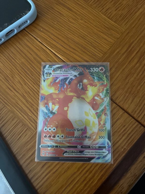 Le dos du Dracaufeu Vmax semble trop sombre. La qualité de la photo empêche de voir si il y a autre chose.