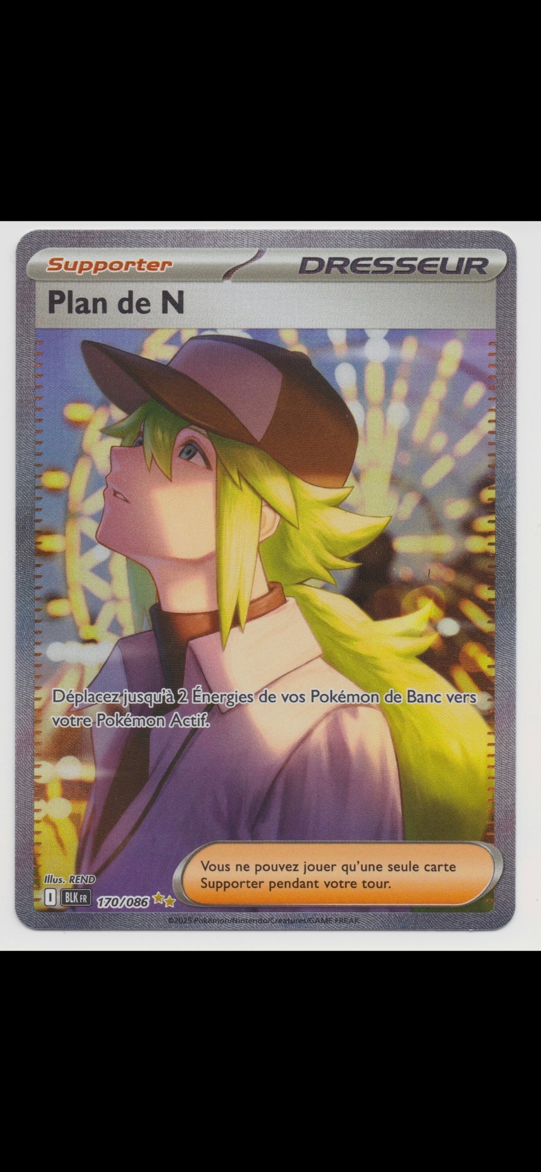 Je viens de m'offrir Plan de N alternative de Foudre Noire, je ferai une photo à la réception. C'est clairement pour moi la plus belle carte dresseur alt du bloc E&V (avec Roseille alt de Mascarade)