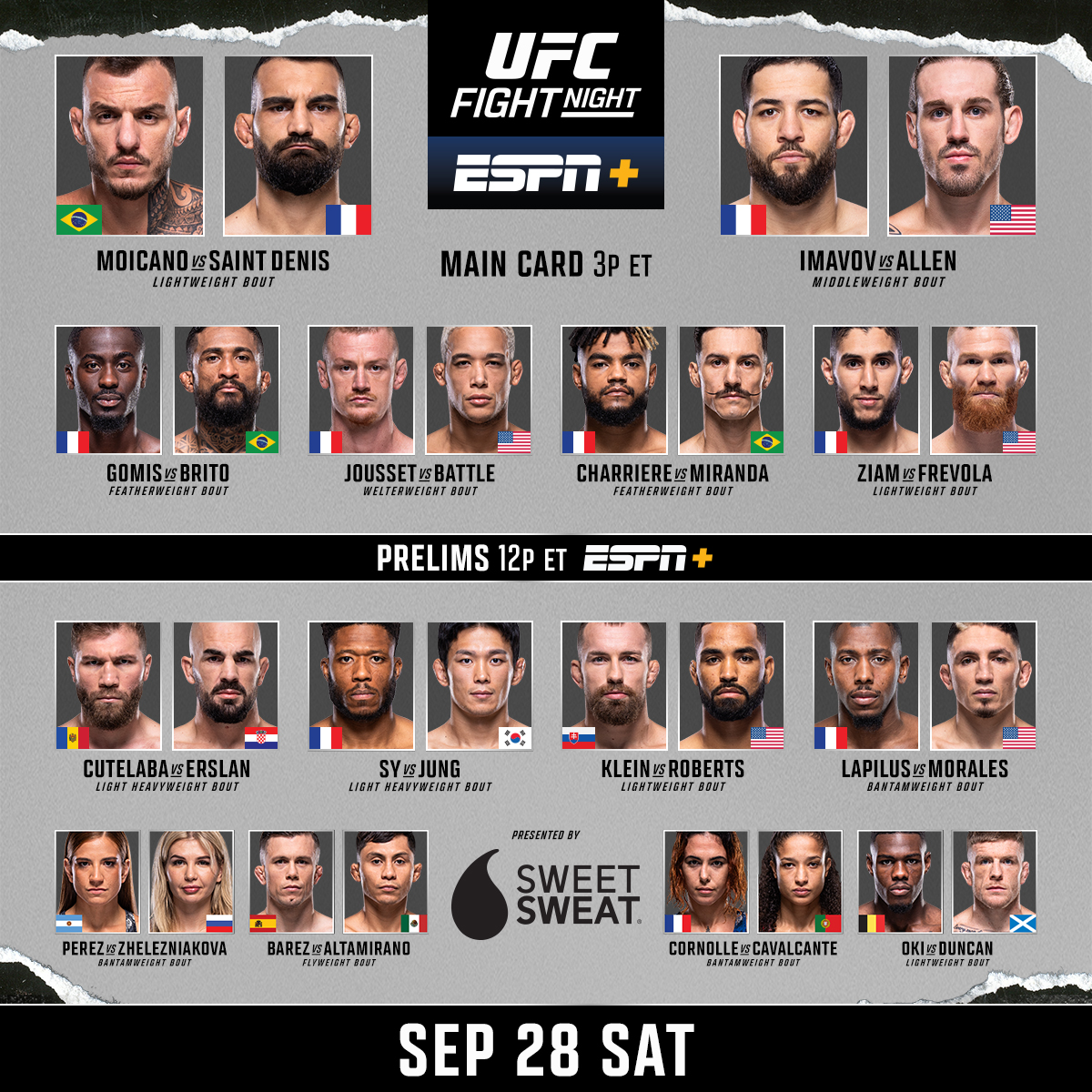 La soirée débutera à 18h avec la carte préliminaire (sept combats), diffusée gratuitement sur la chaîne Twitch de RMC Sport. Trois combattants tricolores ouvriront le bal (Oumar Sy, Taylor Lapilus, Nora Cornolle).À partir de 20h30, tous les combats (Cutelaba-Erslan, Ziam-Frevola, Charrière-Miranda, Jousset- Battle) seront diffusés sur RMC Sport 1. À partir de 22h30, les trois derniers combats (Gomis-Brito, Imavov-Allen, Moicano-Saint Denis) seront disponibles sur RMC Sport 1 mais aussi gratuitement sur RMC Decouverte (canal 24 de la TNT).