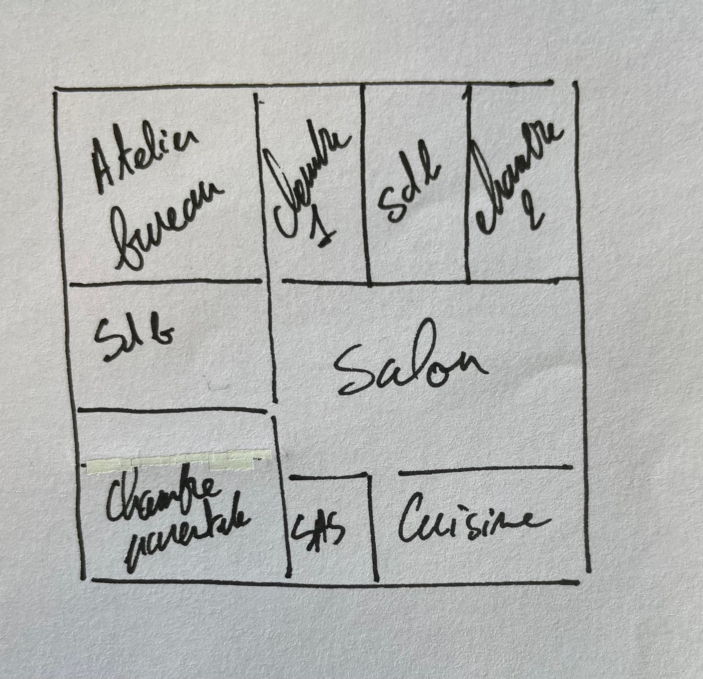 J’ai regroupé l’atelier et le bureau mais ça peut ne pas convenir à tout le monde, pareil pour les chiottards soit dans la salle de bain soit séparés d’une cloison