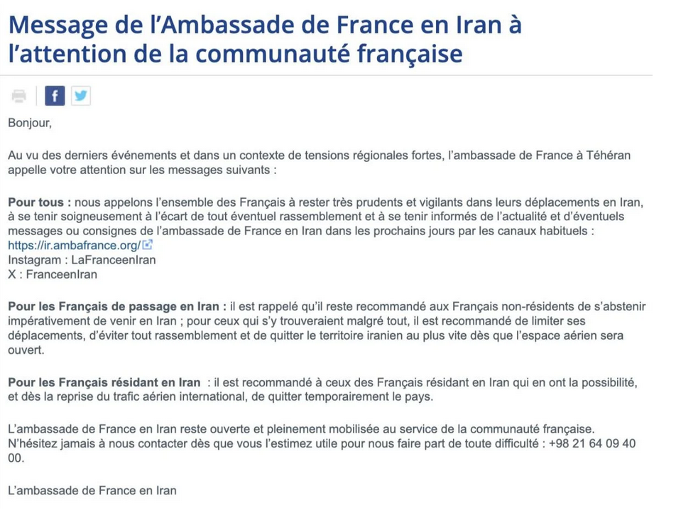 Dans un communiqué daté de ce jour, l'ambassade de France en Iran demande à tous les Français de passage dans le pays de "quitter le territoire iranien au plus vite dès que l’espace aérien sera ouvert".