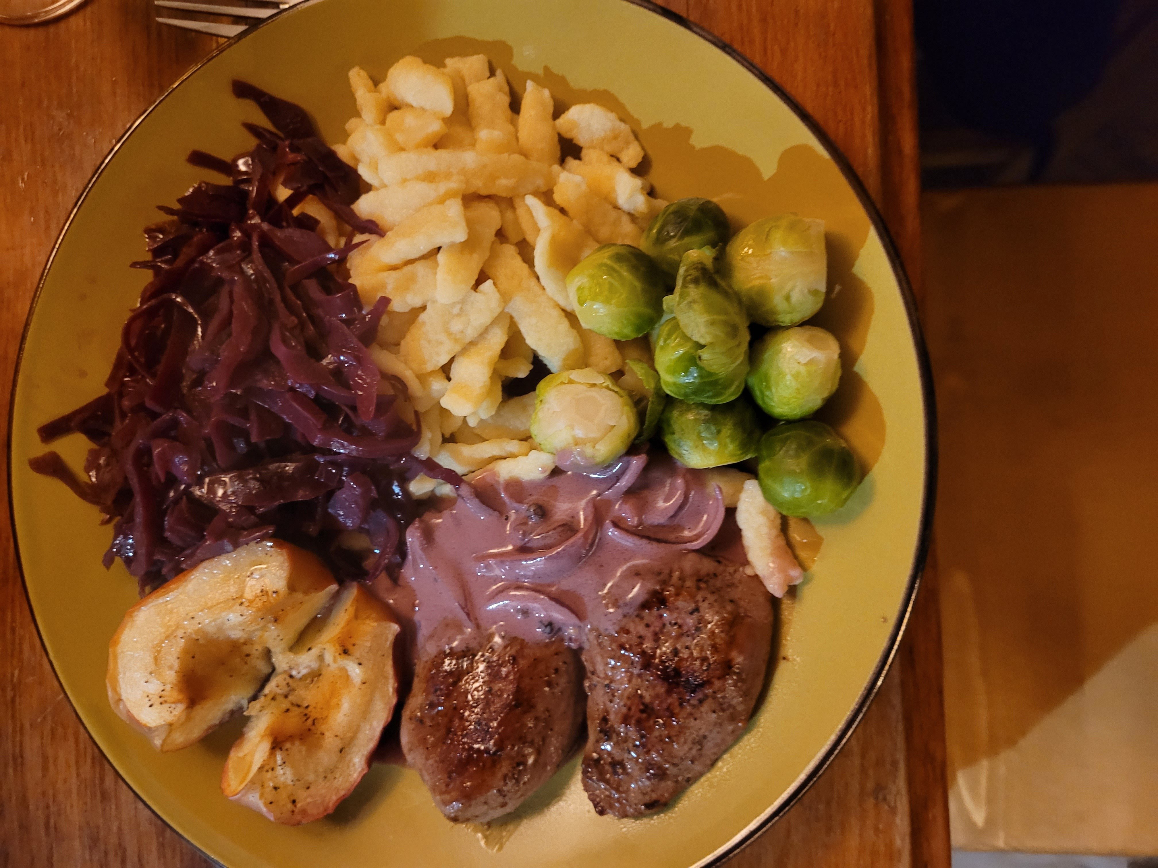 Repas de chasse que je viens de me faire ce soir. Escalope de chevreuil sauce chasseur, choux rouge cuit avec confiture et vin rouge, choux de Bruxelles, spatzli et pomme cuite au four avec laurier et beurre.