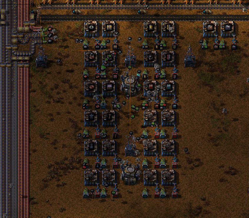 On commence à mettre en place de groooooooosssses zones de minage sortant 8 blue belts de minerais de fer et cuivre, on va faire de gros gros smelting pour déboucher sur au moins 4 blue belt de circuits vert, 2 rouges et 3/4 bleus j'espère