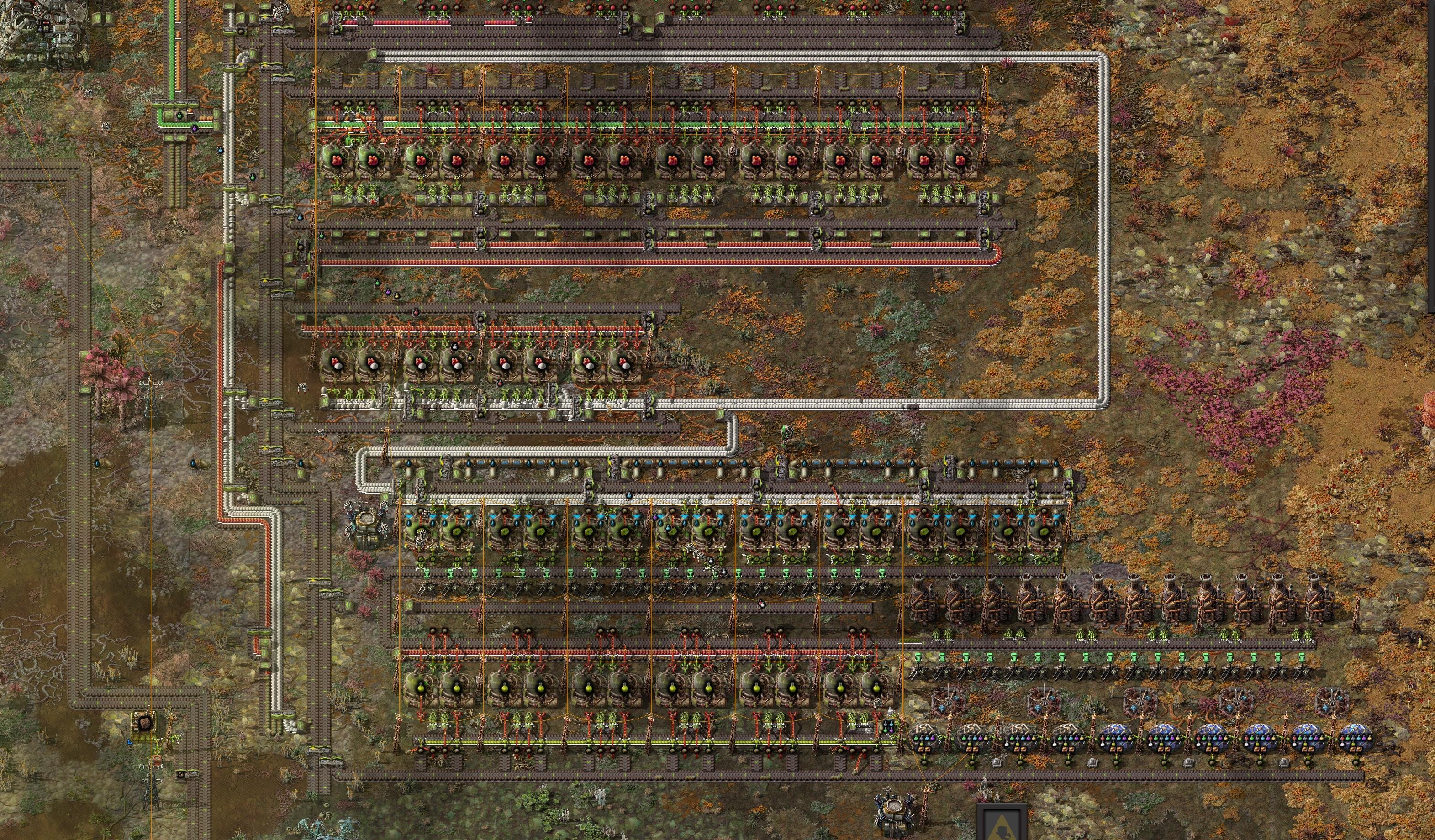 > > > Je viens de terminer de créer une usine de cartes rouges. La prochaine étape, c'est de créer une usine pour créer massivement des fioles de recherche de toutes les couleurs, qui recevrait donc le matériel nécessaire par train, ce qui me permettrait alors de me concentrer sur le reste. Le soucis, c'est la place que ça demande, et il va falloir que j'aille purger un peu autour de ma base les nids qui m'encerclent un peu trop...