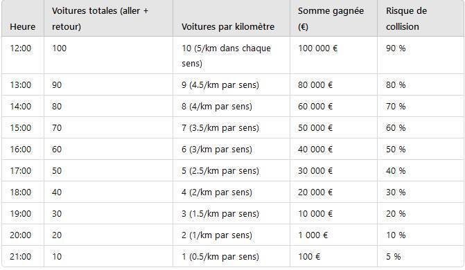 Vous avez le choix de l’heure, mais chaque heure d’attente réduit la prime de moitié, et la circulation diminue d’environ 3 voitures (1,5 par sens).