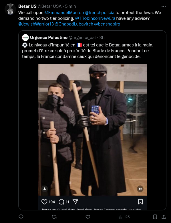 Le 14 novembre 2024 à 13:25:47 Testignoul a écrit :Le 14 novembre 2024 à 13:24:03 :Depuis quand les ultras sont célébrés par la préfecture ? https://www.sudouest.fr/international/moyen-orient/israel/qu-est-ce-que-le-betar-ce-mouvement-juif-qui-organise-un-rassemblement-le-13-novembre-a-paris-22123117.php Disons que tout le monde n'a pas les mêmes passe-droits