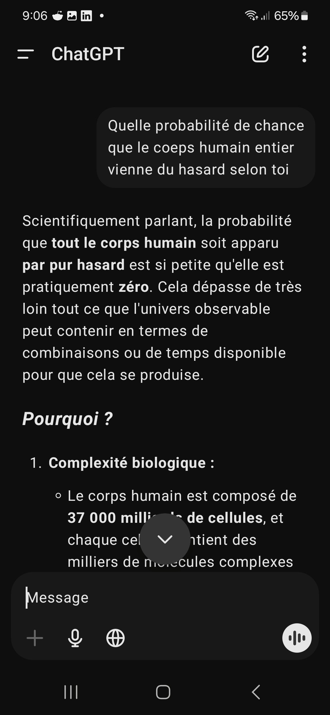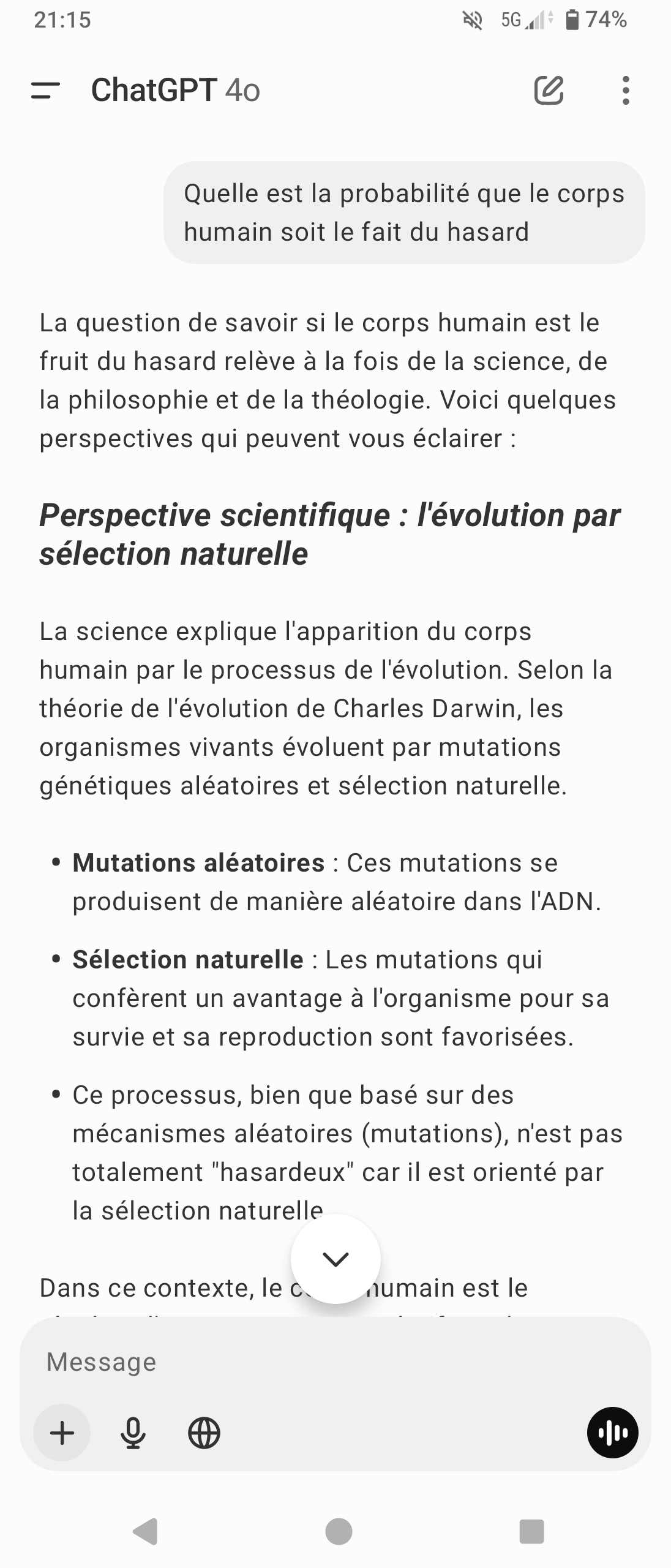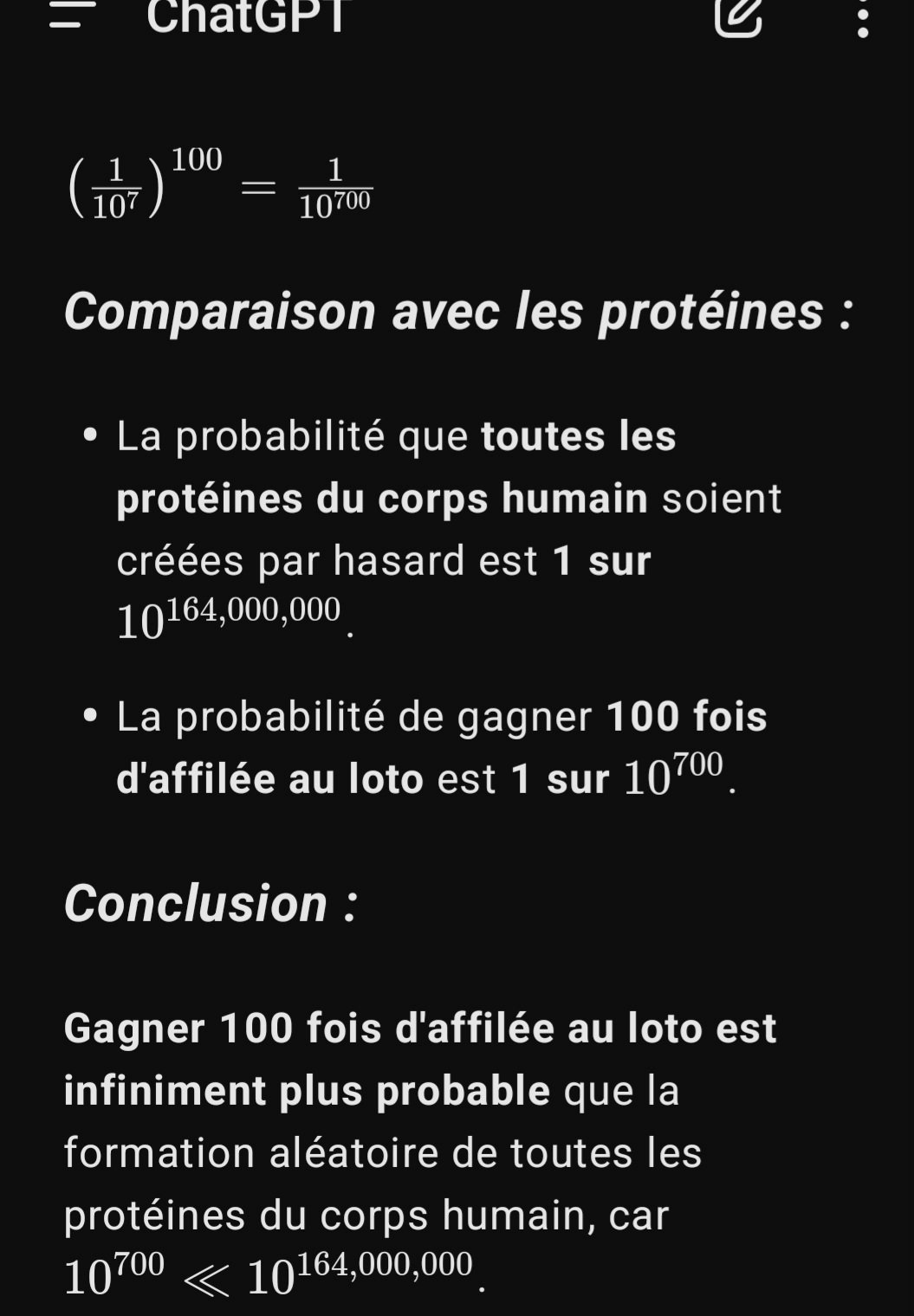 Le 23 décembre 2024 à 21:18:46 :Le 23 décembre 2024 à 21:15:44 : gagner 100 fois d'affilé au loto est infiniment plus probable que le corps humain soit venu au hasard , ahiBordelent t'arrives à foirer une conversation à un robot et finir dans ton biais de confirmation