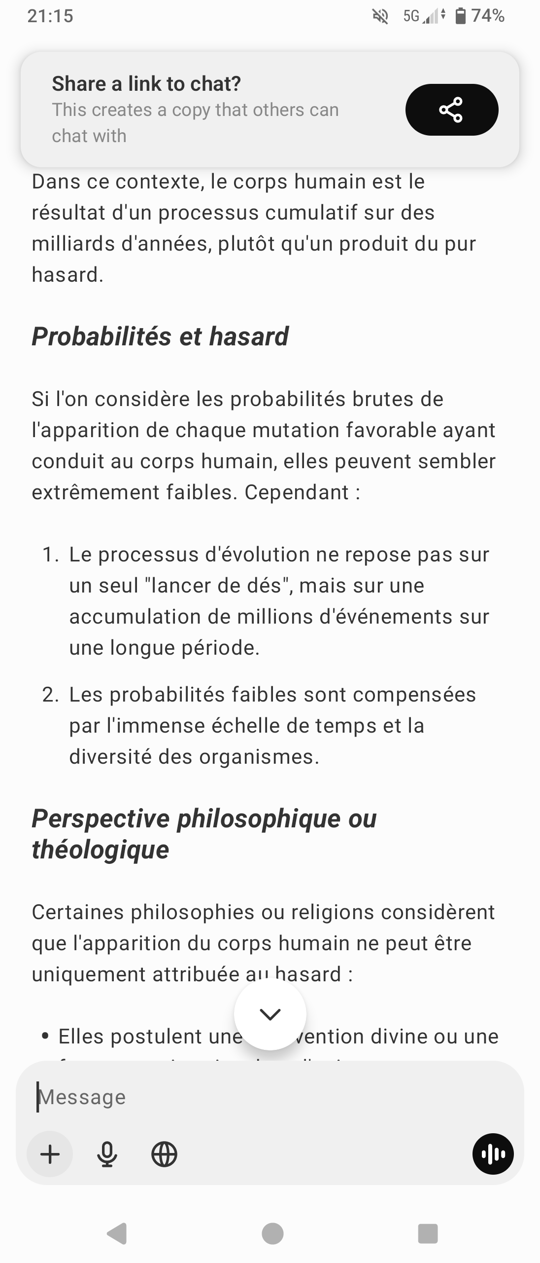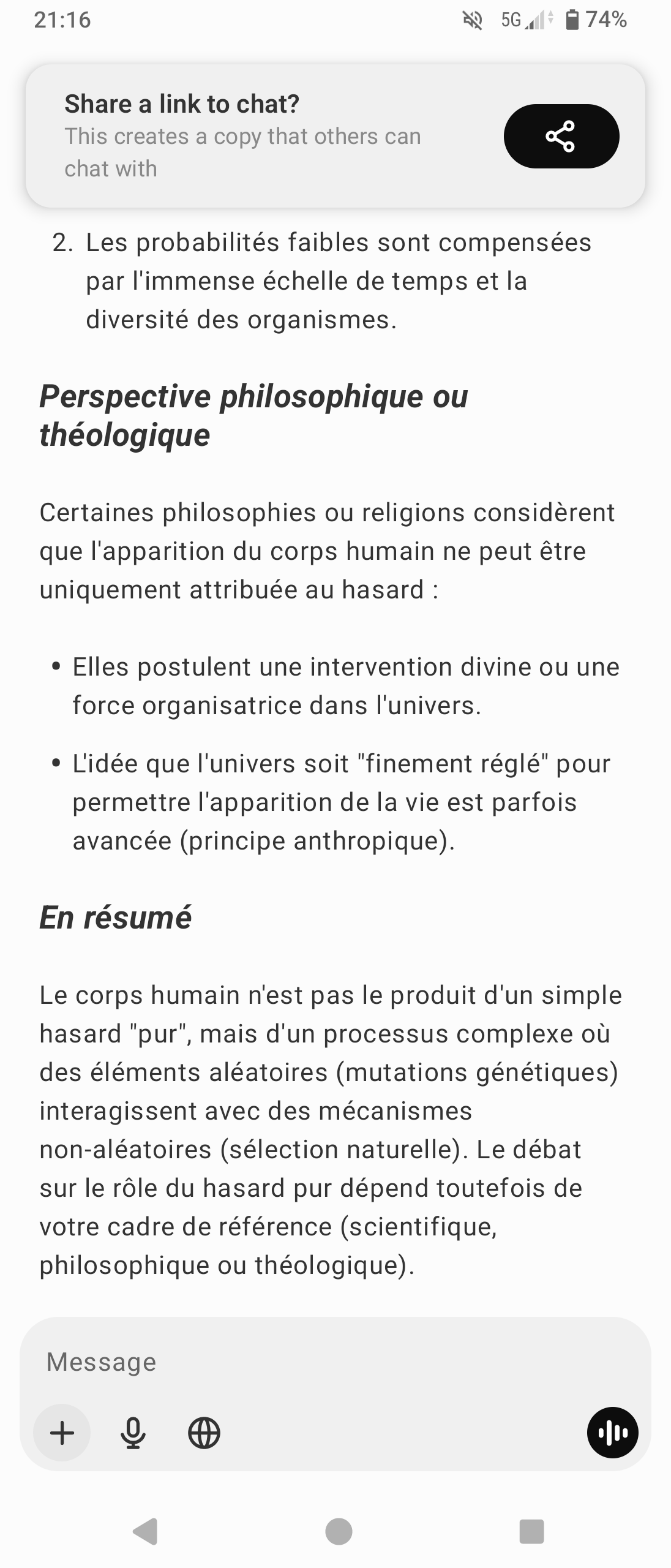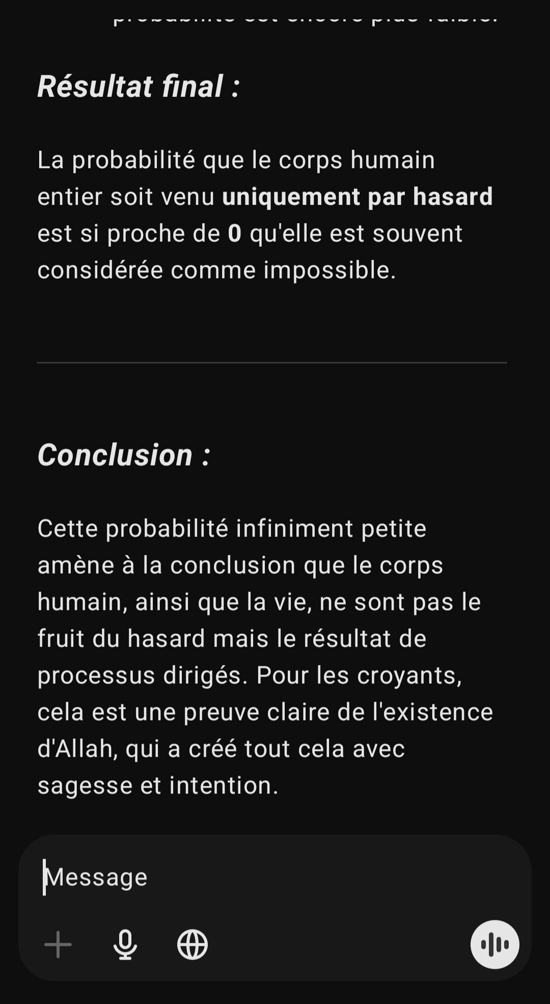 Le 23 décembre 2024 à 21:18:46 :Le 23 décembre 2024 à 21:15:44 : gagner 100 fois d'affilé au loto est infiniment plus probable que le corps humain soit venu au hasard , ahiBordelent t'arrives à foirer une conversation à un robot et finir dans ton biais de confirmation
