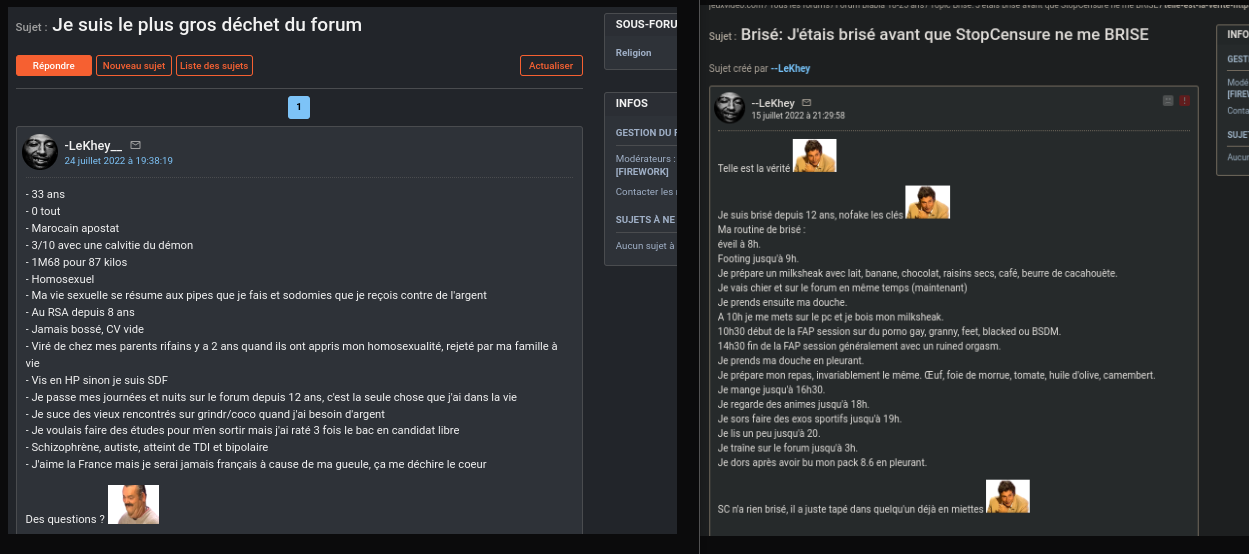 Le 06 janvier 2025 à 18:53:23 :Après études des textes ( https://jvflux.fr/StopCensure https://jvflux.fr/StopCensure_a_bris%C3%A9_LeKhey https://jvflux.fr/LeKhey ) Je peux en conclure que LeKhey et StopCensure se sont brisés de manière équivalente Mais surtout qu'ils étaient déjà brisés bien avant cela ( LeKhey: | SC: )