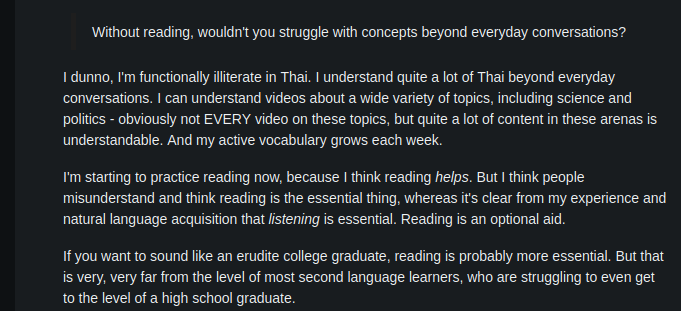 c'est aussi un énorme boucleur sur le thaï. d'ailleurs à 1200h d'apprentissage il sait toujours pas lire et est convaincu que ça sert à rien de savoir lire/écrire. il est persuadé que tout le monde devrait apprendre "comme un enfant", et donne des conseils en disant que ça sert à rien d'ouvrir un livre sauf si tu veux apprendre à parler comme un philosophe