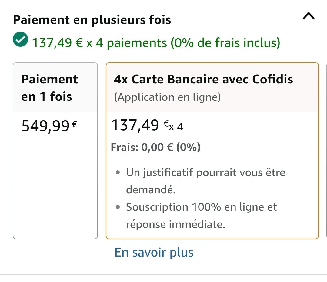 J'ai déjà essayé avec Amazon mais lors du payement l'option paye en 4 fois s'affiche pas