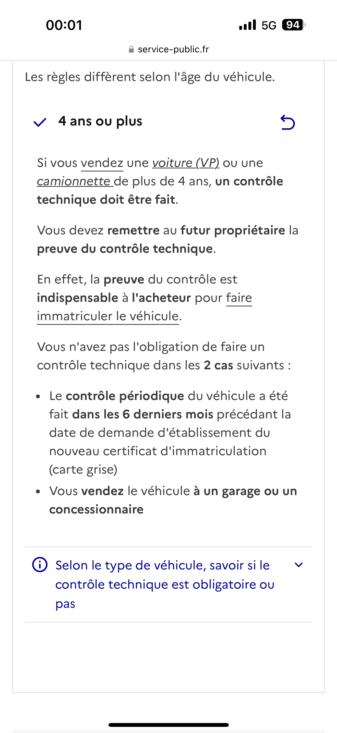 "Si vous vendez une voiture (VP)Véhicule à moteur, construit et conçu pour le transport de personnes, ayant au moins 4 roues, comportant, en plus du siège du conducteur, 8 places assises au maximum, et dont le poids total en charge autorisé (PTAC) est inférieur à 3,5 tonnes. ou une camionnette Véhicule conçu et construit pour le transport de marchandises ayant un poids maximal inférieur ou égal à 3,5 tonnes. Le certificat d'immatriculation indique le genre CTTE. Appelé camionnette ou utilitaire léger.de plus de 4 ans, un contrôle technique doit être fait.