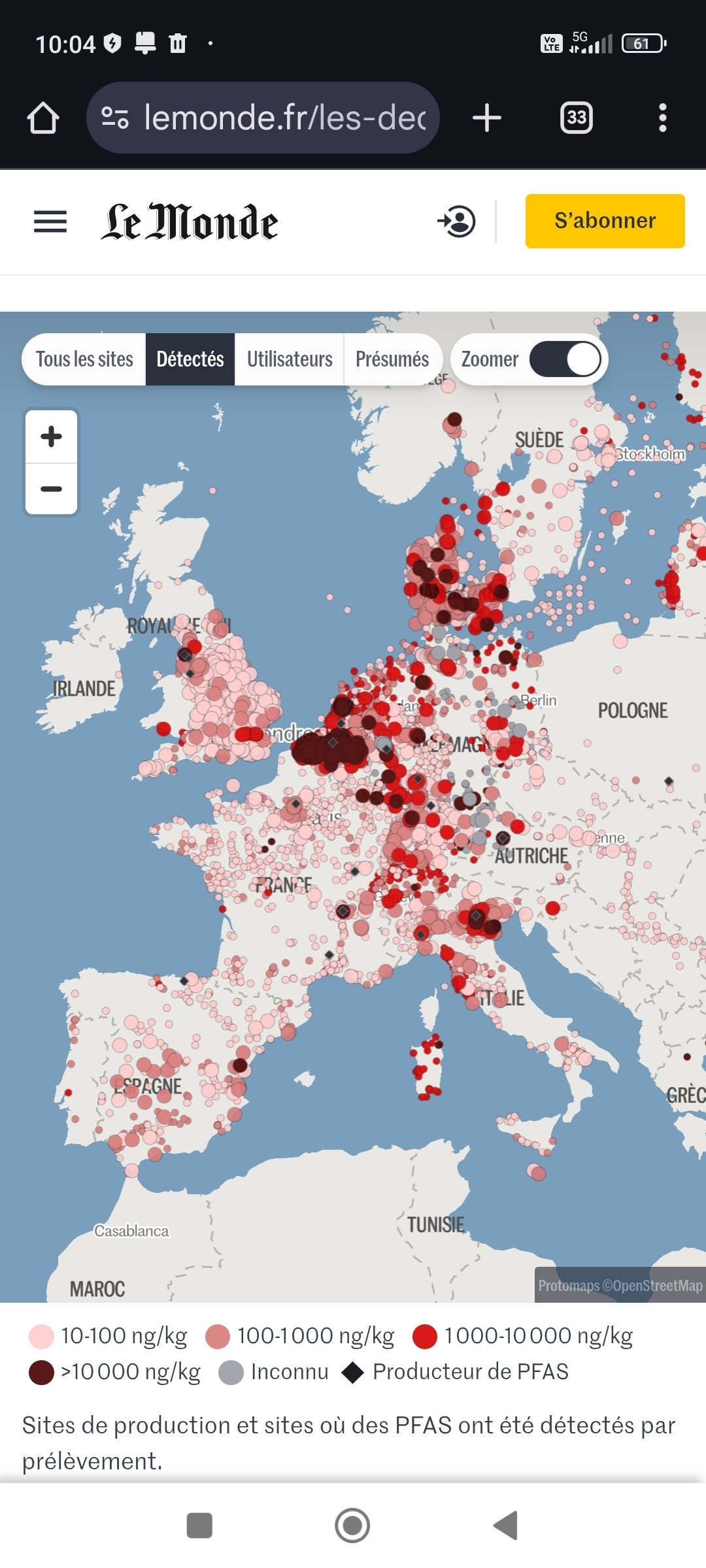 Exact, ce sont des relevés(voir sur le site lemonde car je n'ai posté qu'une capture d écran), avec les usines qui utilisent ou fabriquent ces molécules, par exemple leurs rejets dans les rivières alentours. Il y a des puits un peu partout qui sont testés visibles sur la carte.