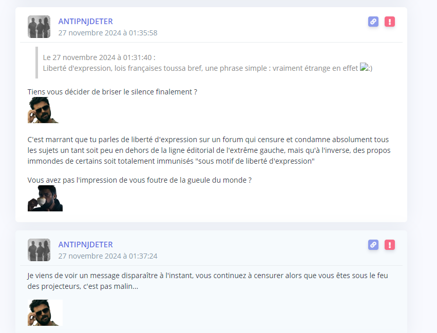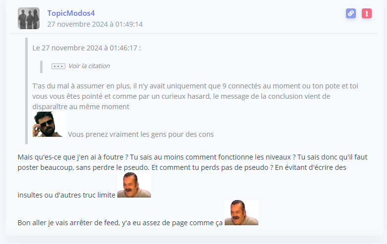 Ouais mais du coup, la plainte elle est ou ? Vous en avez pas marre de boucler ? C'est la boucle la plus foireuse depuis des lustres, pire que lebosslelite et ses topics donuts