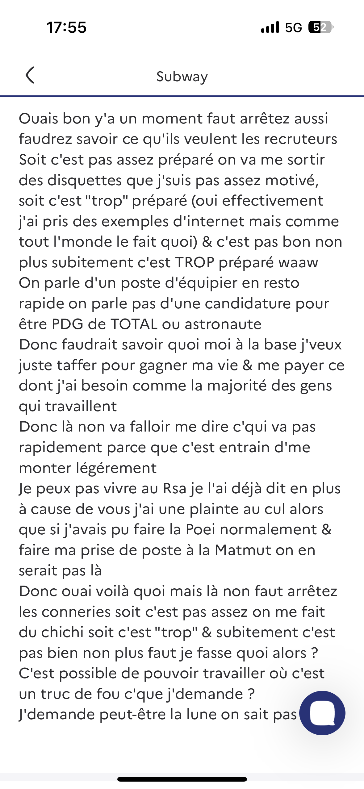A croire j'ai postulé pour être PDG de Total on sait pas c'est vrai que pour faire des sandwich à la con faut au moins être passionné depuis la naissance & vendre sa daronne sur un plateau d'argent sinon on va te sortir des disquettes agneu mey vou avey tro ressitey votr teyxteu Bah oui tu veux j'te dise quoi d'autre tu veux j'te montre mes factures à payer en mode elles se payent par magie on sait pas