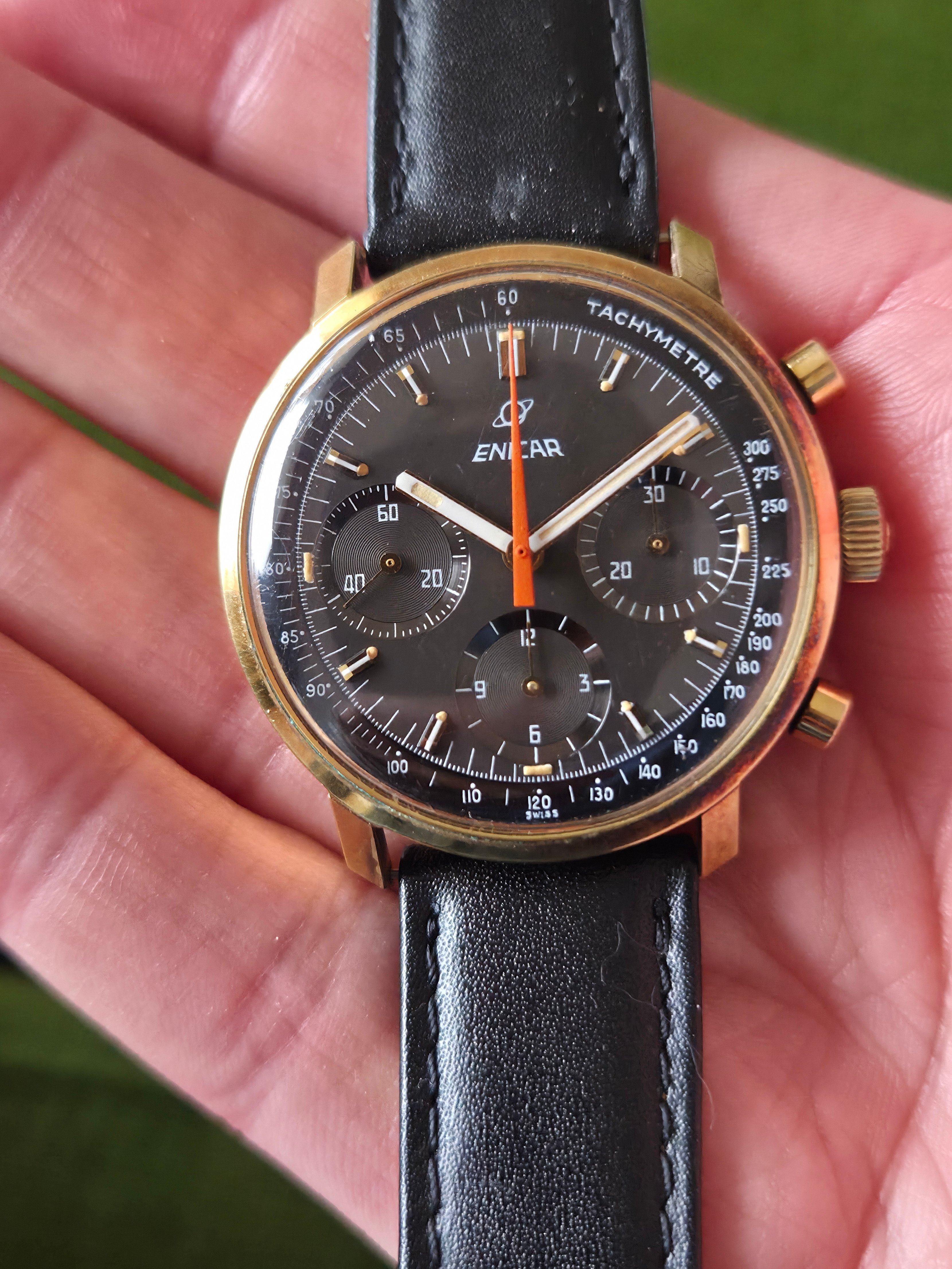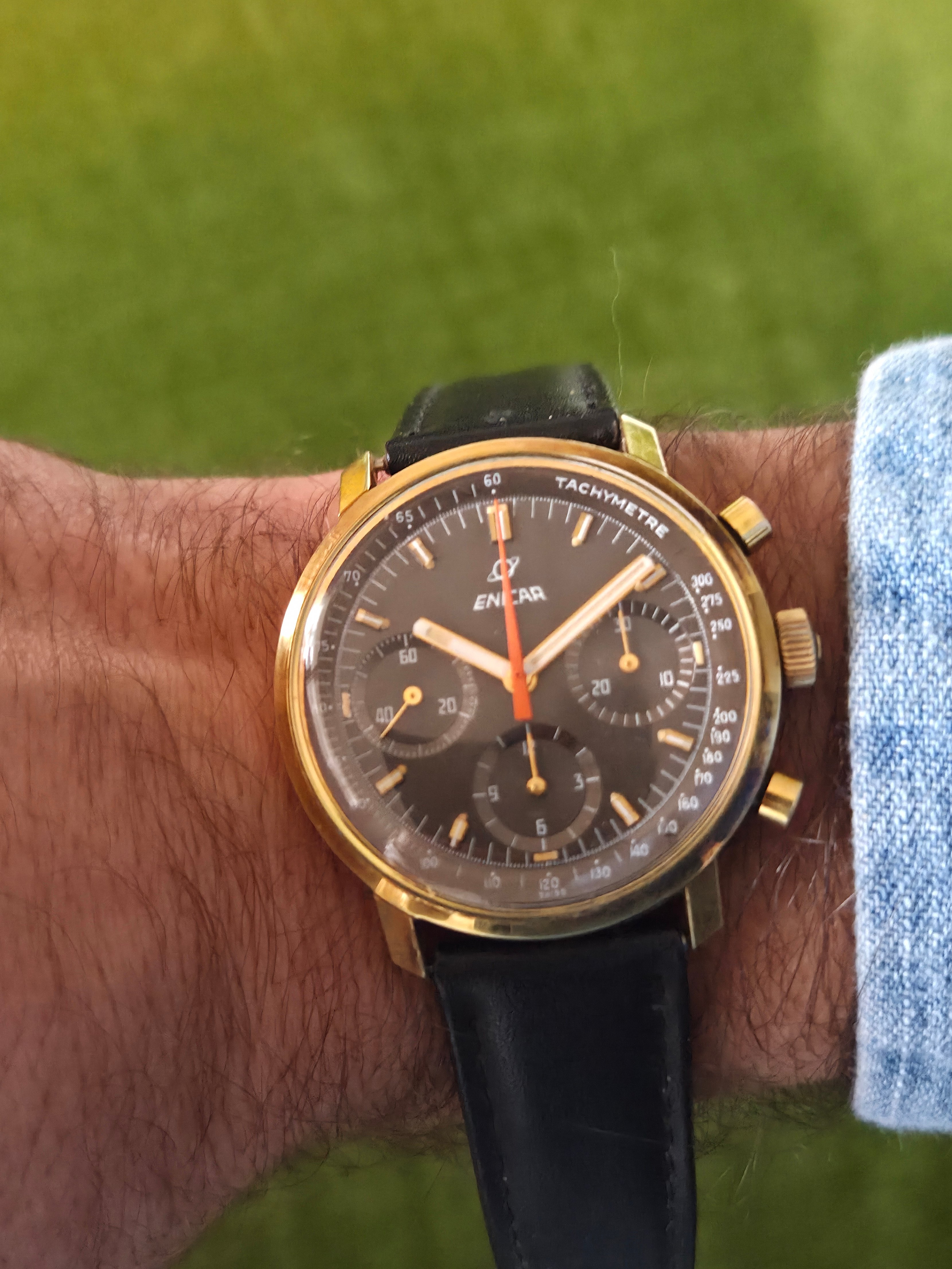 Enicar "garnix" des années 60. 36.5mm. La sherpa graph du pauvre. Cadran/aiguilles en parfait état. Mouvement valjoux 72 plaqué rose dans un étar neuf (probablement jamais touché) c'est pornographique.Elle parait plus grosse que 36,5, ou alors tu as un tout petit poignet