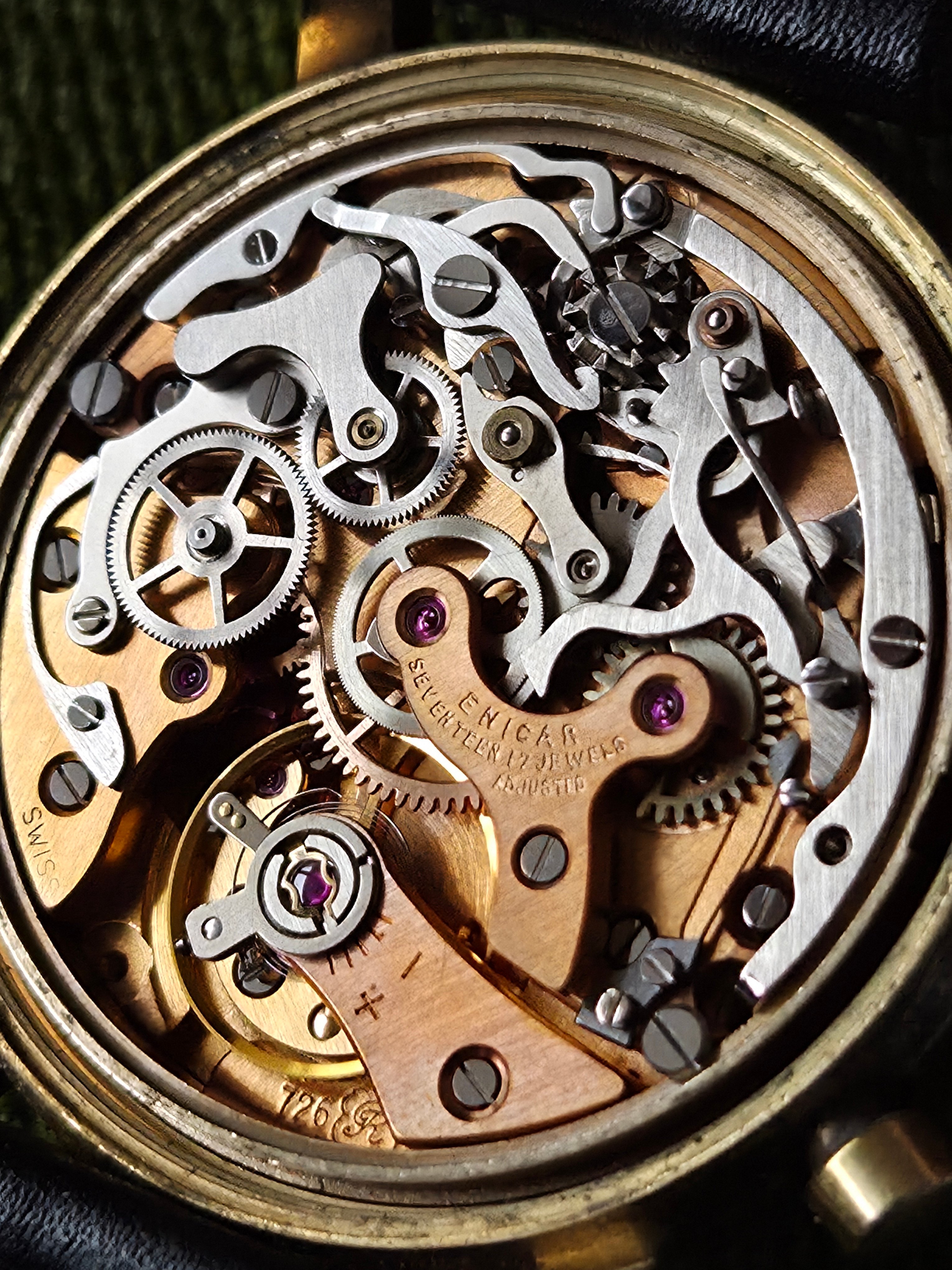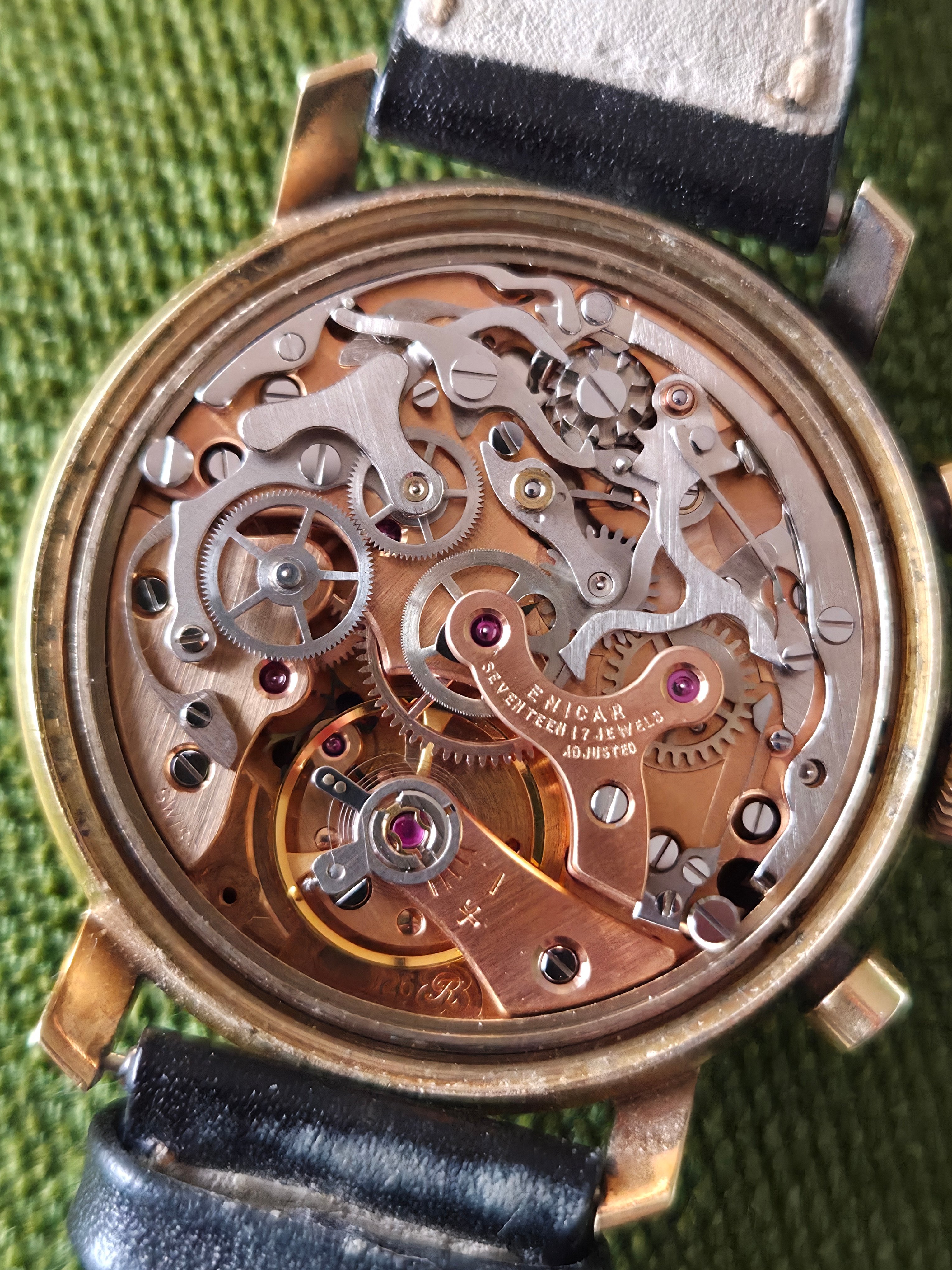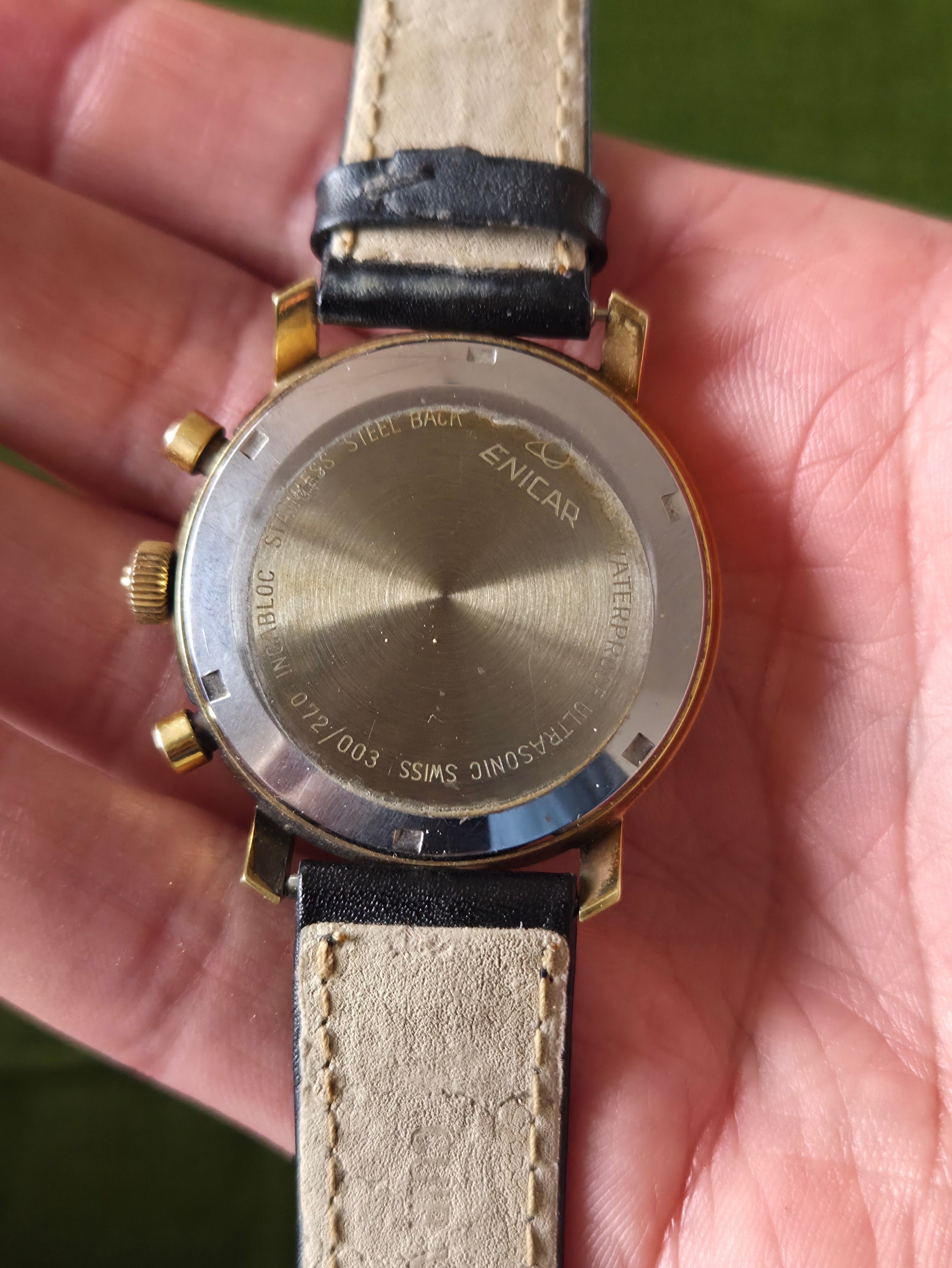Enicar "garnix" des années 60. 36.5mm. La sherpa graph du pauvre. Cadran/aiguilles en parfait état. Mouvement valjoux 72 plaqué rose dans un étar neuf (probablement jamais touché) c'est pornographique.
