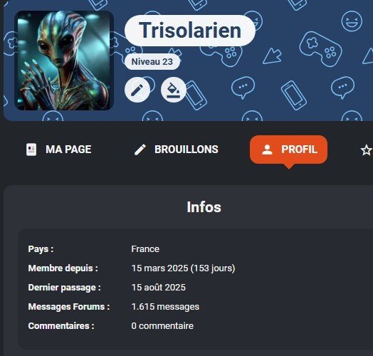 D'ailleurs, premier topic de Trisolarien : 16 mars 2025, donc minimum, il y a 5 mois. Mais il a eu le temps d'oublier son seul autre pseudo en 5 mois![]()