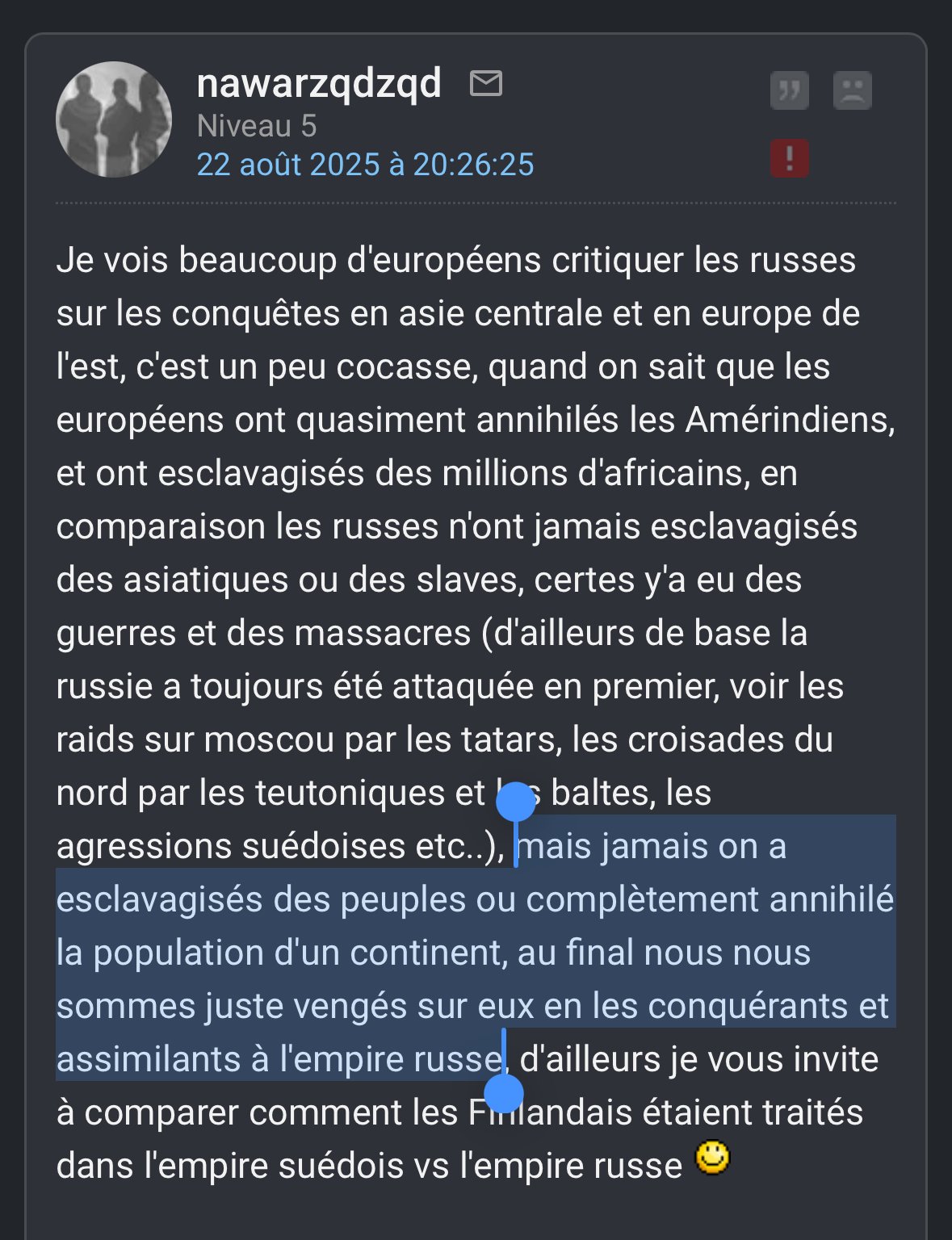 je passe vite fait sur le topic et c'est ouf ce que je viens de voir. entre le mec qui partage une vidéo d'exécution de soldats russes par dronne dont un il montre l'agonie, avec une musique comme si c'était "cool" et toi avec ta "blague" qui n'est même pas potache mais complètement ridicule et malaisante...
