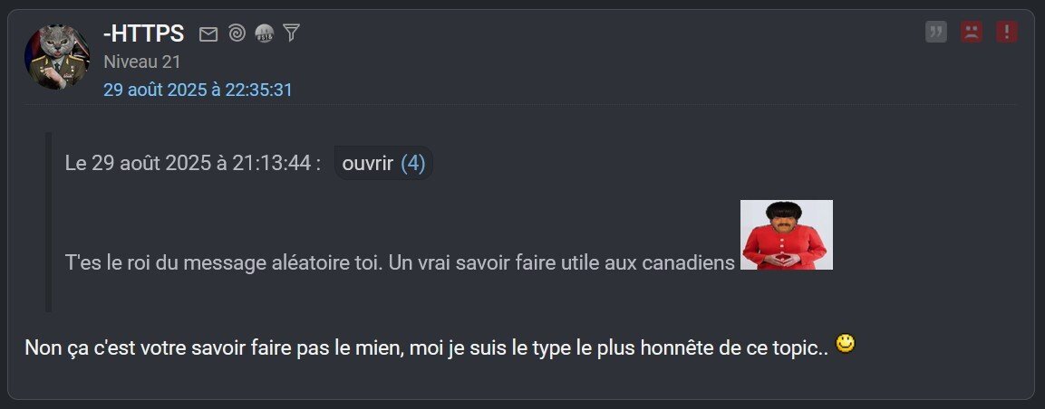 T'es le roi du message aléatoire toi. Un vrai savoir faire utile aux canadiens