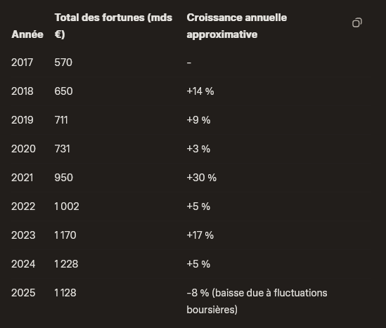 Pour les milliardaires seuls, selon Forbes, le total net en dollars est passé de 221 milliards en 2017 à environ 510 milliards en 2022 (dernières données complètes disponibles), avec une poursuite de la hausse jusqu'en 2025, dominée par des figures comme Bernard Arnault (LVMH, fortune estimée à 155 milliards de dollars en temps réel).