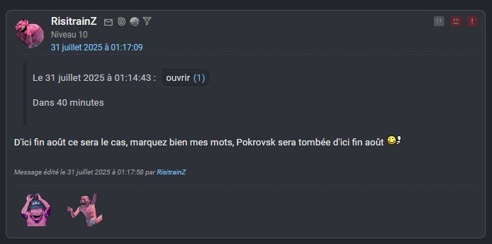 Je sais que les caméras de beaucoup de localité autour ont été partagé,, que la population a communiquer avec l'armée ukrainienne, permettant aux ukrainiens de frapper les points de rassemblement, ainsi que 3 QG russes. Je sais aussi que pas mal de convois russes en direction du chaudron se sont fait abattre avant même d'avoir dépasser les zones russes. Hormis un massacre des troupes russes, il s'est passé un truc ? Les bots russes disaient que les russes allaient prendre prokovsk, pour le moment hormis des vidéos de russe qui s'y font massacrer, rien de spécial 🤷Et big up aux ukrainixs en territoires controlés qui rencardent les forces ukrainiennes et font massacrés les rassemblements de troupes russes : on vous aime