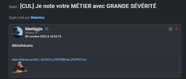 > > > > > > > Puis j’avais vu que dans un de ses messages qu’il se disait « bibliothécaire » et dans un autre qu’il travaillait dans un collège
