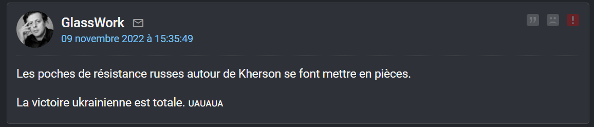 > > > Bonjour, quelles sont les nouvelles de l'opération de guerre éclair ultra special éditon de 3 ans et 9 mois de la 2ème armée du monde ? Cette fois c'est la bonne ? Kiev est aux mains des russes, le gouvernement est remplacé et le pays démilitarisé comme prévu ? Les pays ont arrêté de rejoindre l'OTAN ? l'économie russe se porte à merveille ? Cette promenade de santé face à la terrifiante Ukraine sera sans doute racontée dans les livres d'histoire