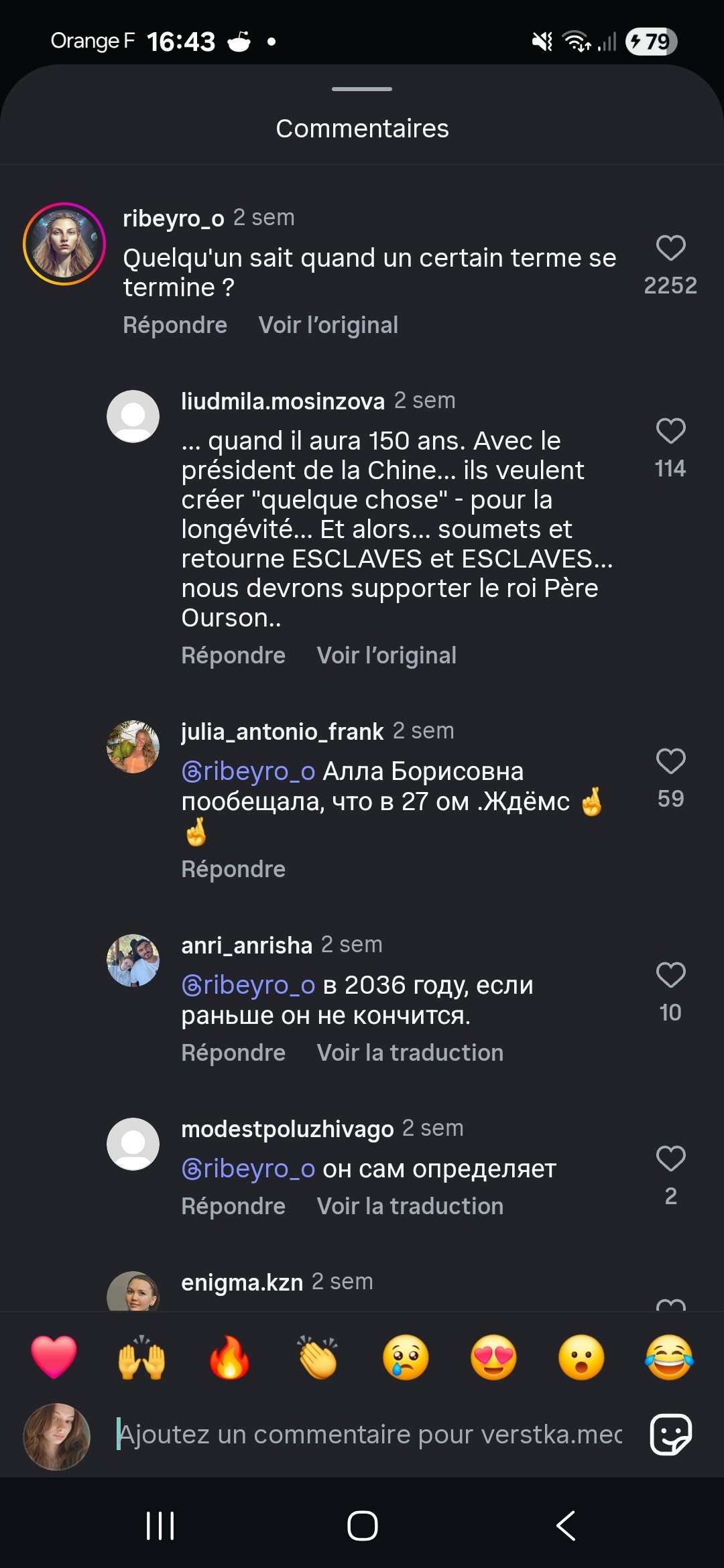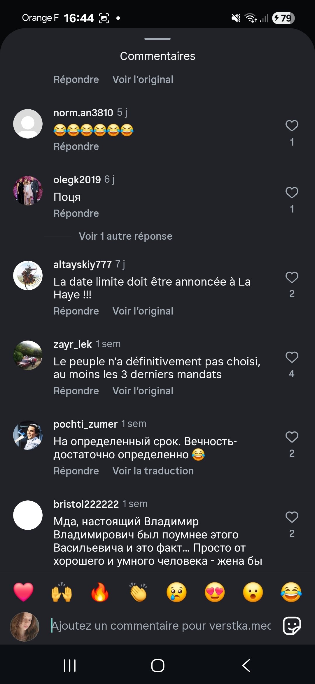 Okay bon, les bots russes qui veulent te faire croire que Poutine est adore de son peuple. Sur une page russe, j'ai retrouvé des commentaires de vrais russes. Tous soutiennent en grande majorité que ca fait facile depuis 3 mandats qu'il ne devrait plus etre là selon la volonté du peuple. Le peuple russe veut un nouveau Président. Ne croit plus en ses mensonges.Bien tenté, mais non.