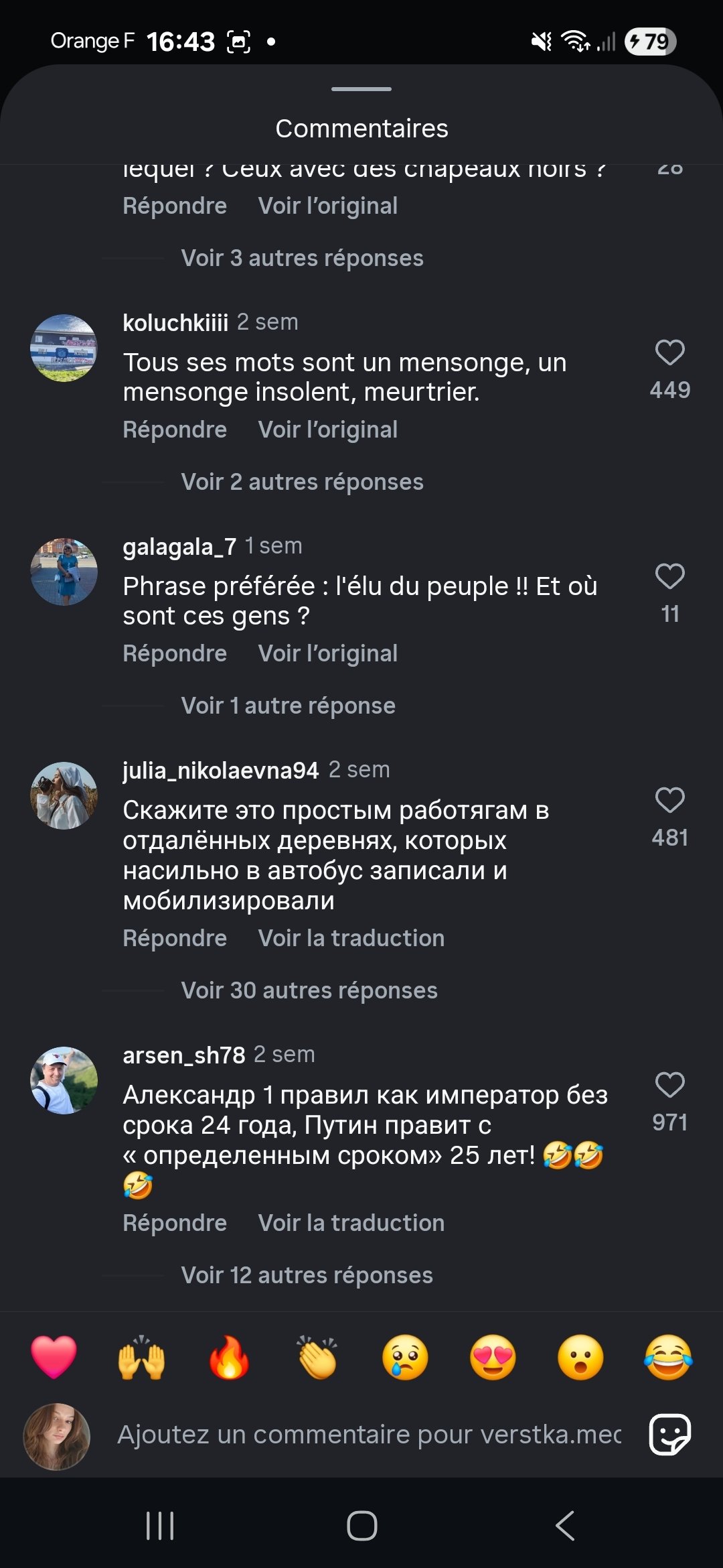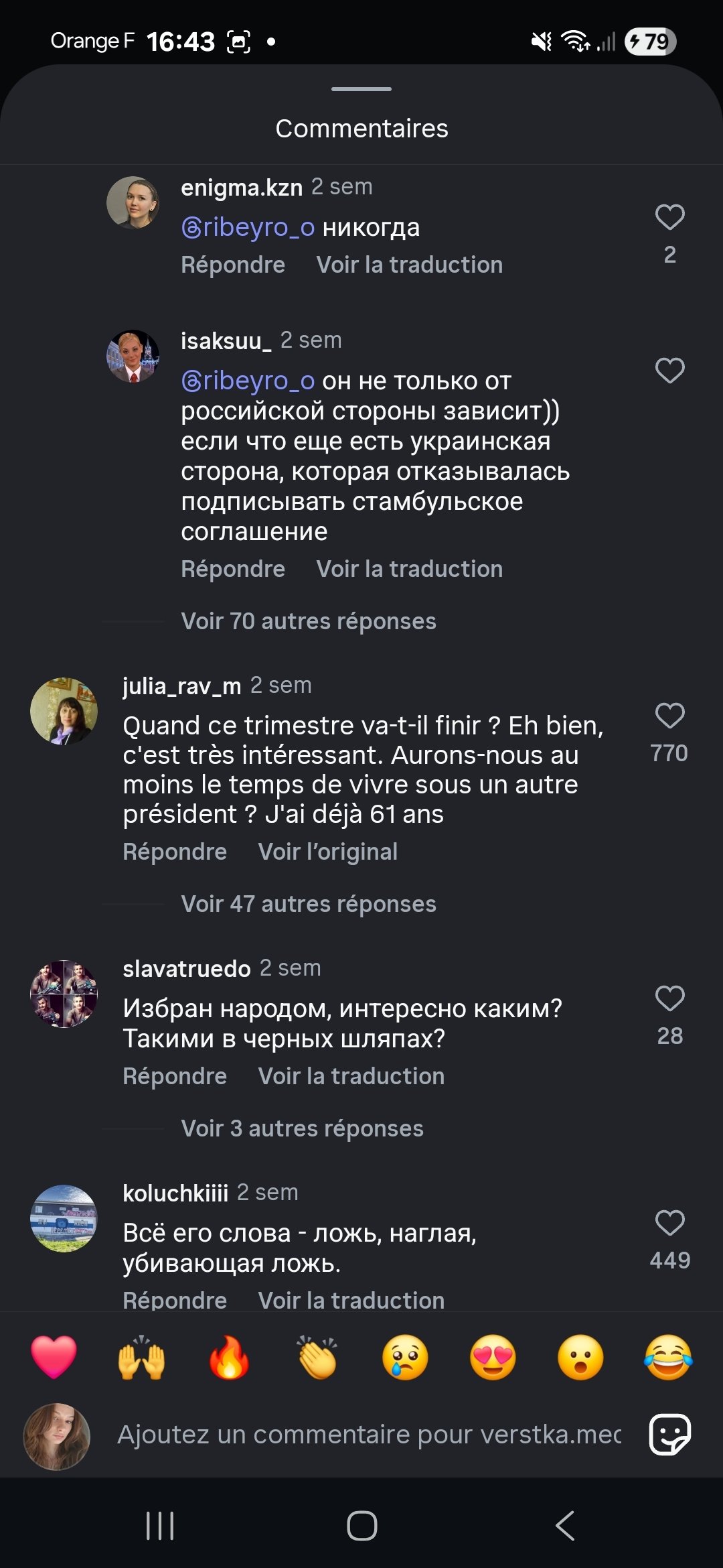 > Okay bon, les bots russes qui veulent te faire croire que Poutine est adore de son peuple. Sur une page russe, j'ai retrouvé des commentaires de vrais russes. Tous soutiennent en grande majorité que ca fait facile depuis 3 mandats qu'il ne devrait plus etre là selon la volonté du peuple. Le peuple russe veut un nouveau Président. Ne croit plus en ses mensonges.