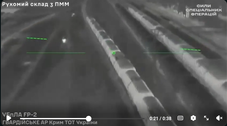 Des drones des forces spéciales ukrainiennes ont frappé plusieurs dépôts de carburant en Crimée occupée. Un réservoir RVS-400 plein a été détruit sur le site pétrolier de Hvardiiske, ainsi que deux trains de ravitaillement sur un quai de chargement voisin. D'autres frappes ont été signalées sur des sites de stockage de carburant à Simferopol et dans le village de Bityumne.