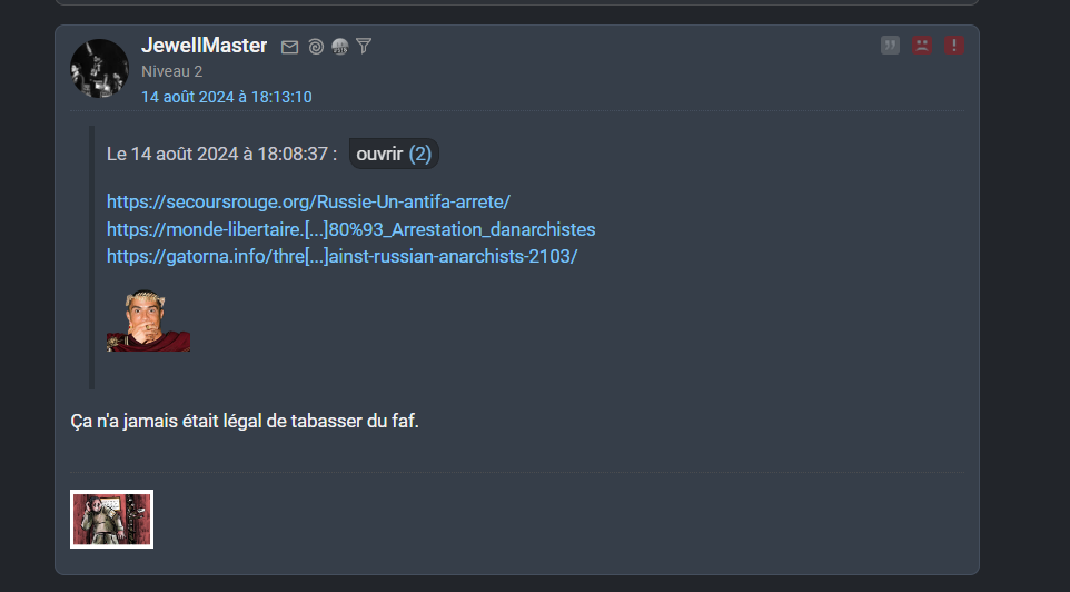 L'anarchisme c'est d'approuver l'arrestation d'anti-fa ayant attaqué des symboles du gouvernement russes car "il n'est pas légal d'attaquer des fachos"