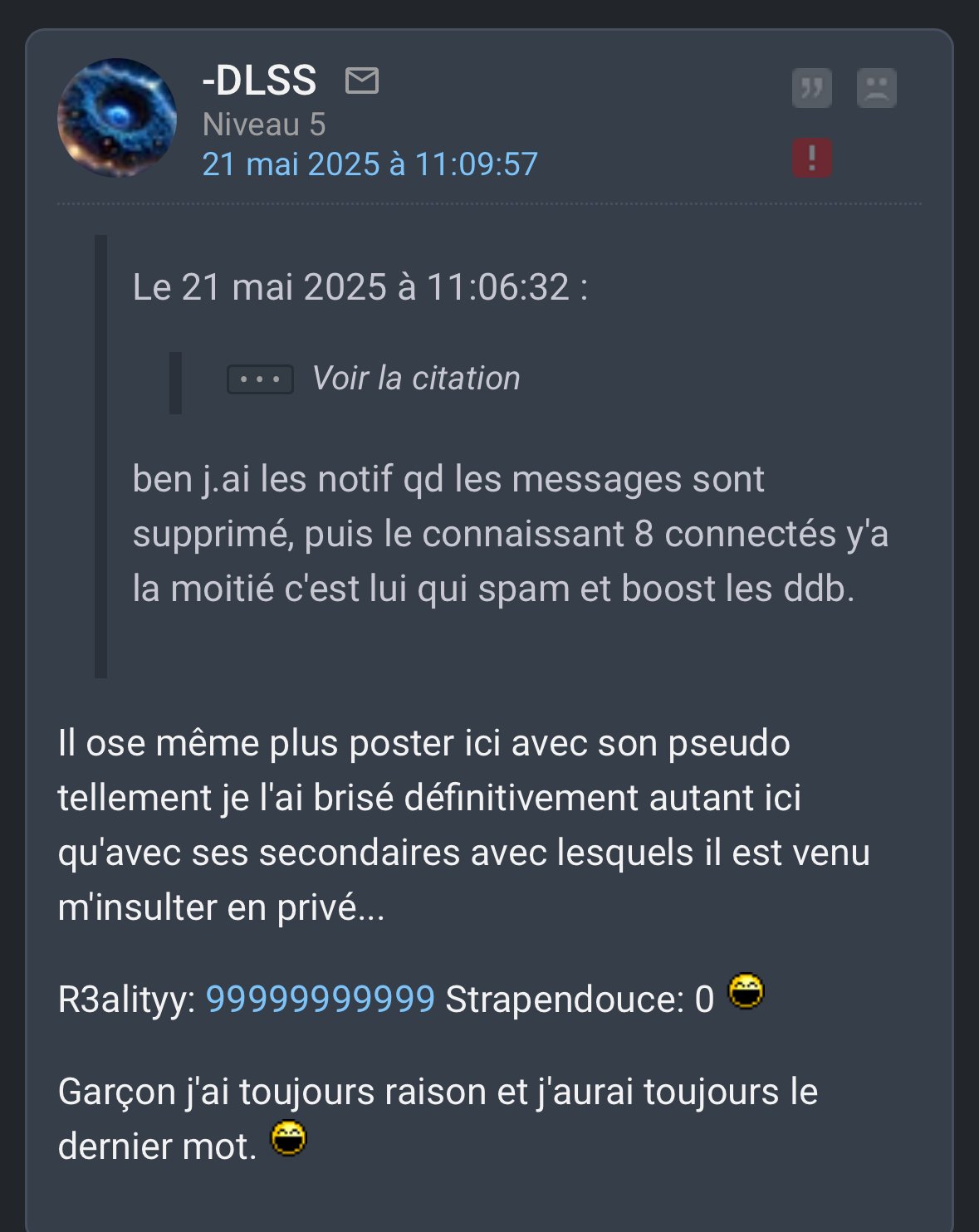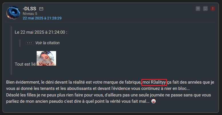 Reality, osef de tes copiés/collés de topics obscènes.Ok strapendouce... 😵💫 Mais encore une fois je ne suis pas reality je suis -DLSS puisque reality n'est plus... 🙂