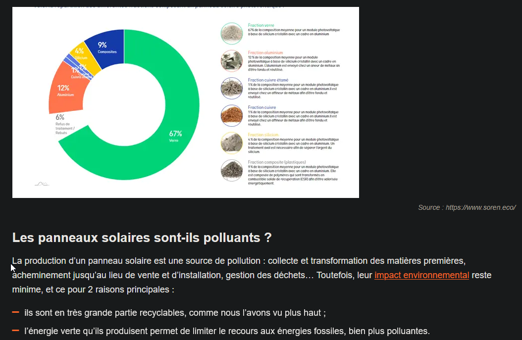 On considère aujourd’hui que 94 % des matériaux d’un panneau solaire sont recyclables, contre 70 % il y a encore quelques annéePour le rendement en hiver, c'est vrai qu'il diminue grandement, ça dépend de l'endroit, de l'entretient, de l'inclinaison.. mais globalement quasi 3 fois moins (surtout décembre/janvier)