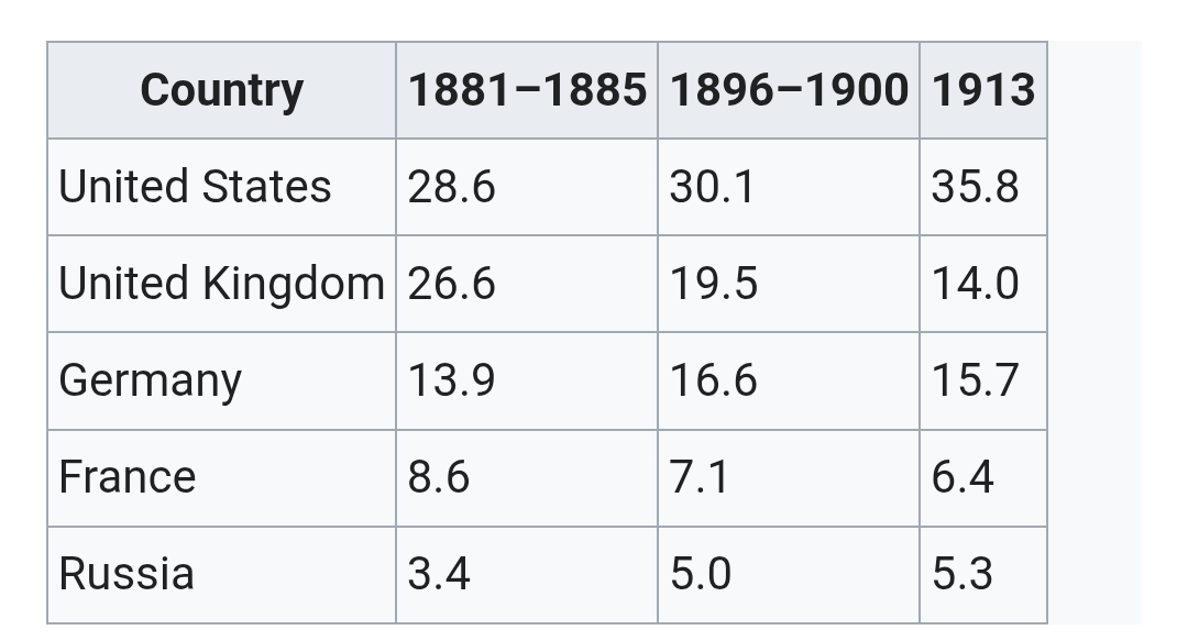 Au passage, en 1913 la Russie était le plus gros pib d'Europe a égalité avec l'Allemagne (en revanche en pib par habitant c'était un peu en dessous du niveau de l'Autriche Hongrie) et était la troisième puissance industrielle. Les campagnes russes étaient arriérés mais la Russie à entre 1905 et 1913 bénéficié d'un développement extrêmement rapide de ses villes et de son coeur industriel (l'explosion rapide de la classe ouvrière à notamment permis la révolution bolcheviks). Lorsque les soviets ont pris le pouvoir la Russie avait déjà un développement industriel décent. Sa grosse faiblesse c'était les infrastructures et tout ce qui etait hors des deux gros cœur industriel qu'était Moscou et Petrograd (Saint Petersbourg).