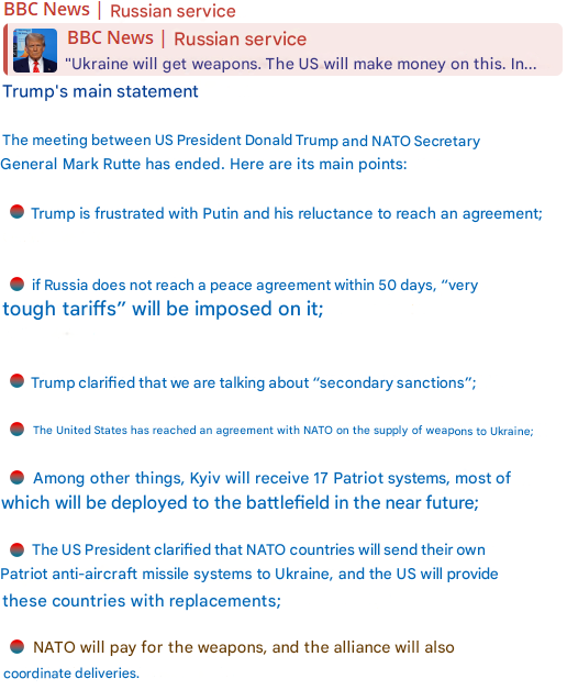 Résumé des annonces:https://www.reddit.com/r/UkraineWarVideoReport/comments/1lzqypv/the_main_thing_from_trumps_statements_via_the_bbc/