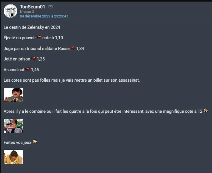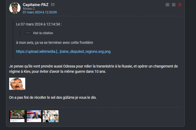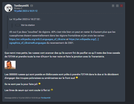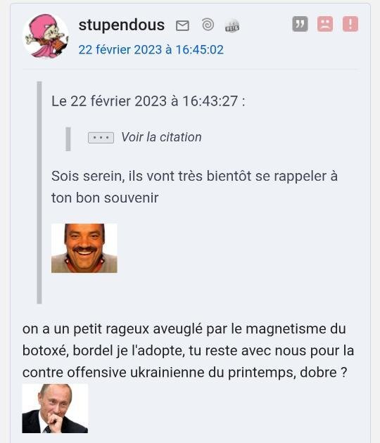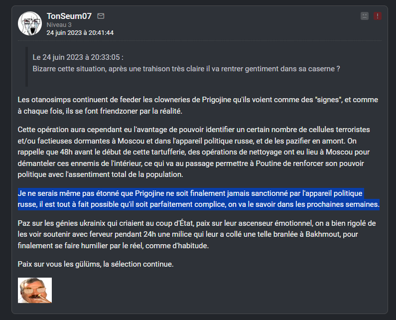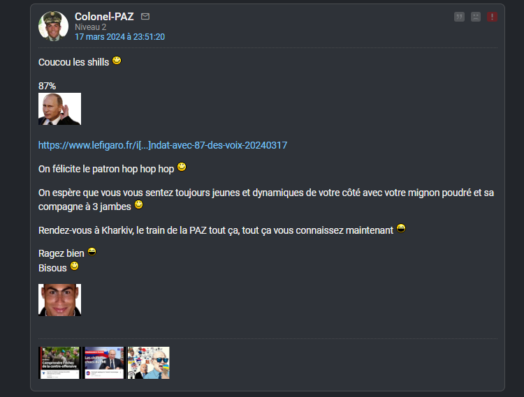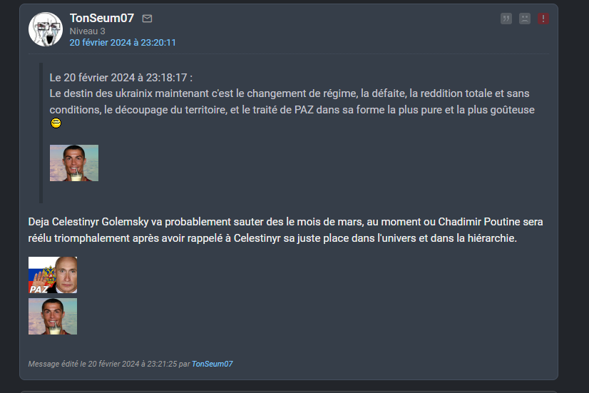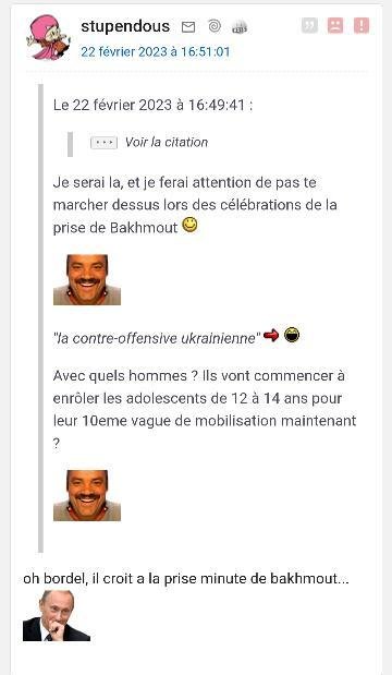 En fait j'ai des centaines de screens de tout ce petit monde, tous ces petits experts en culotte courte, qui se gargarisaient de "la victoire inéluctable de l'Ukraine", je les ai tous sans exception. Tous leurs pseudos, leurs secondaires, leurs prévisions LCI, ca chantait, ca dansait.
