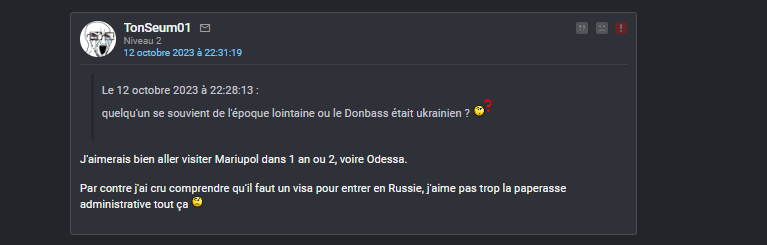 En fait j'ai des centaines de screens de tout ce petit monde, tous ces petits experts en culotte courte, qui se gargarisaient de "la victoire inéluctable de l'Ukraine", je les ai tous sans exception. Tous leurs pseudos, leurs secondaires, leurs prévisions LCI, ca chantait, ca dansait.En dépit du bon sens le plus élémentaire, tous ces génies ont écouté les médias subventionnés et cru leur baratin, de bonne foi sans doute.