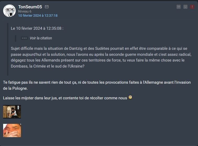 En fait j'ai des centaines de screens de tout ce petit monde, tous ces petits experts en culotte courte, qui se gargarisaient de "la victoire inéluctable de l'Ukraine", je les ai tous sans exception. Tous leurs pseudos, leurs secondaires, leurs prévisions LCI, ca chantait, ca dansait.En dépit du bon sens le plus élémentaire, tous ces génies ont écouté les médias subventionnés et cru leur baratin, de bonne foi sans doute.