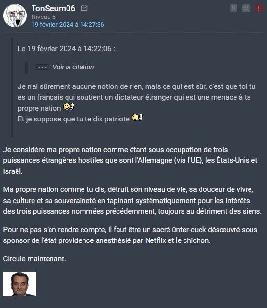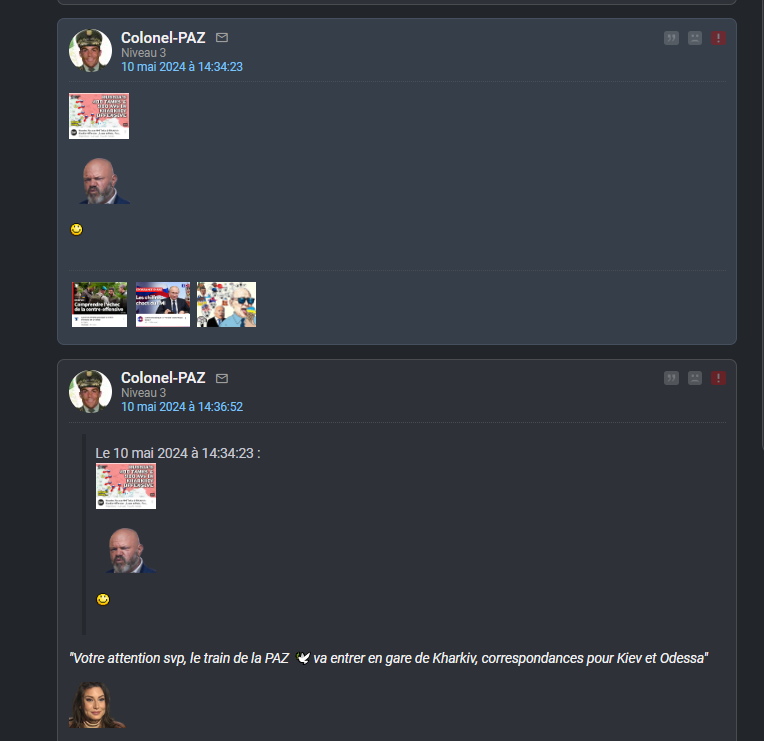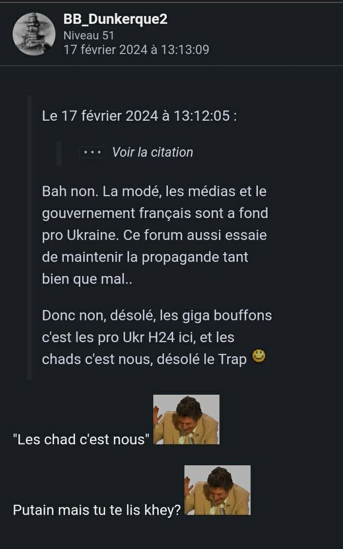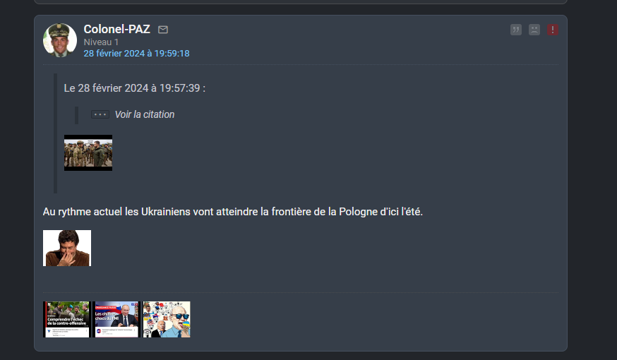 Je ne confonds pas mes désirs avec la réalité, au contraire de la tripotée de sous doués pro ukrainix qui couvrent ce conflit H24 7/7 depuis 3 ans sur ce forum.