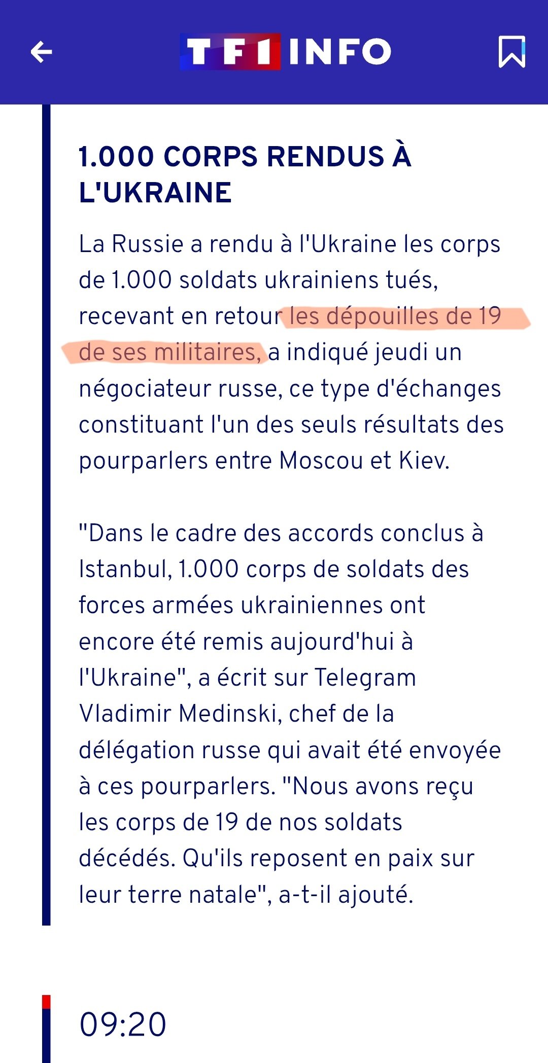 Soit le rapport de pertes est de 1 russe pour 52 ukrainiens sur un front statique, soit les russes progressent vite vers l'ouest et ramassent les corps ennemis qui sont situés de leur côté de la ligne de front au fur et à mesure qu'ils avancent vers l'ouest. Soit éventuellement un subtil mélange des deux.